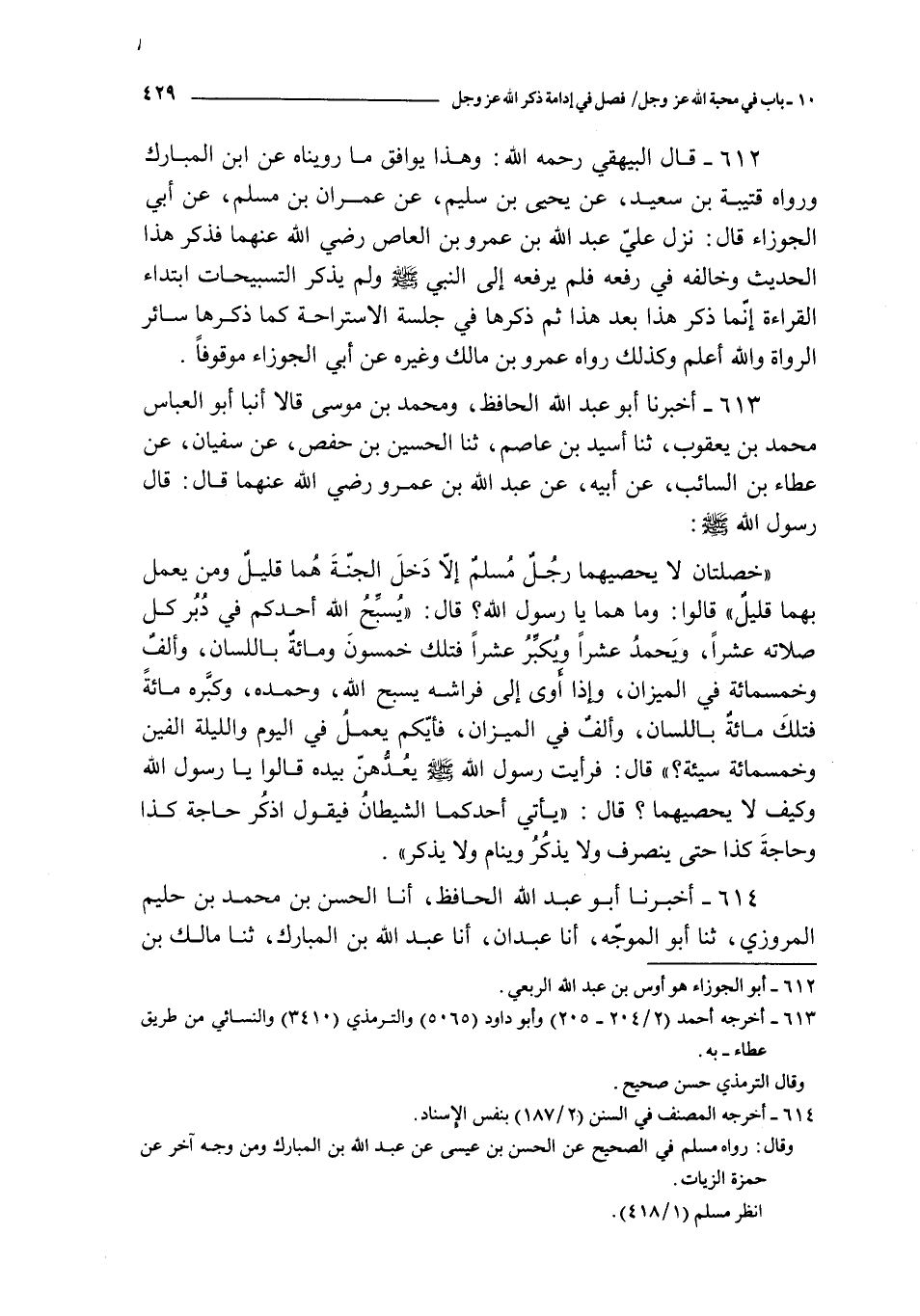 612 - قال البيهقي رحمه الله : و هذا يوافق ما رويناه عن ابن المبارك و رواه قتيبة بن سعيد عن يحيى بن سليم عن عمران بن مسلم عن أبي الجوزاء قال : نزل علي عبد الله بن عمرو بن العاص رضي الله عنهما فذكر هذا الحديث و خالفه في رفعه فلم يرفعه إلى النبي صلى الله عليه و سلم و لم يذكر التسبيحات ابتداء القراءة إنما ذكر هذا بعد هذا ثم ذكرها في جلسة الاستراحة كما ذكرها سائر الرواة و الله أعلم و كذلك رواه عمرو بن مالك و غيره عن أبي الجوزاء موقوفا
