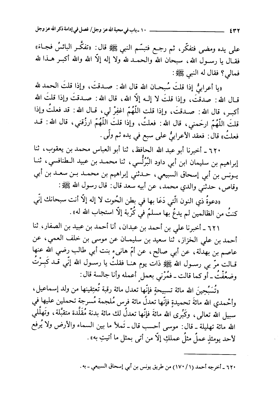 تسبحين الله مائة تسبيحة فإنها تعدل مائة رقبة تعتقينها من ولد إسماعيل و أحمدي الله مائة تحميدة فإنها تعدل مائة فرس ملجمة مسرجة تحملين عليها في سبيل الله تعالى و كبري الله مائة فإنها تعدل لك مائة بدنة مقلدة متقبلة و تهللي الله مائة تهليلة ـ قال : موسى أحسب قال ـ تملأ ما بين السماء و الأرض و لا يرفع لأحد يومئذ عمل مثل عملك إلا من أتى مثل ما أتيت به