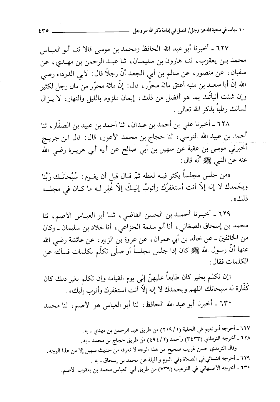 627 - أخبرنا أبو عبد الله الحافظ و محمد بن موسى قالا ثنا أبو العباس محمد بن يعقوب ثنا هارون بن سليمان ثنا عبد الرحمن بن مهدي عن سفيان عن منصور عن سالم بن أبي الجعد : أن رجلا قال : لأبي الدرداء رضي الله عنه إن أبا سعد بن منبه أعتق مائة محرر قال : إن مائة محرر من مال رجل لكثير و إن شئت أنبأتك بما هو أفضل من ذلك إيمان ملزوم بالليل و النهار لا يزال لسانك رطبا بذكر الله تعالى