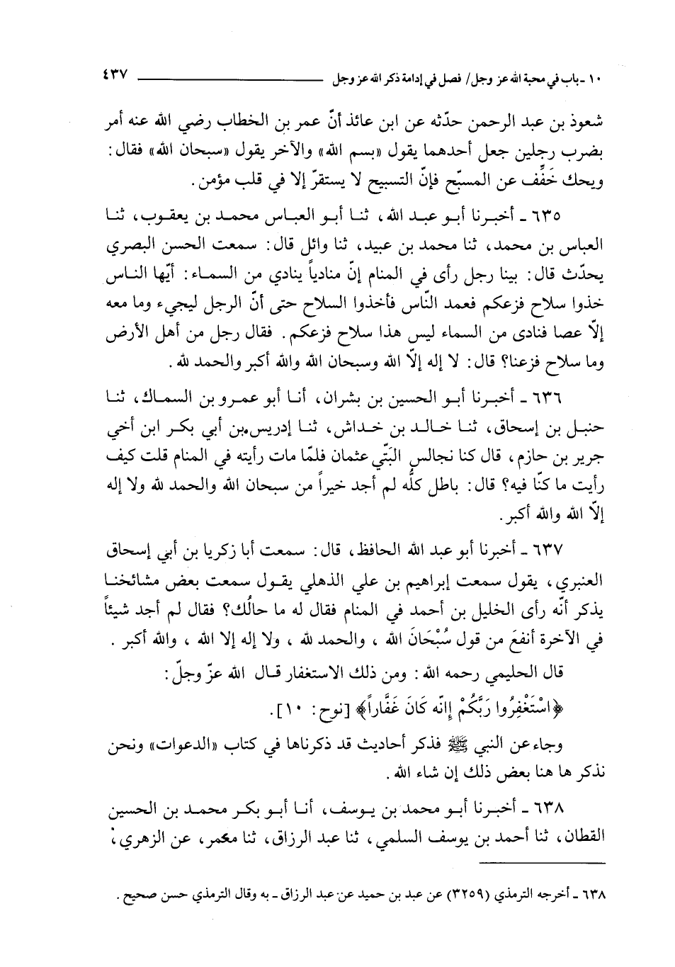637 - أخبرنا أبو عبد الله الحافظ قال : سمعت أبا زكريا بن أبي إسحاق العنبري يقول سمعت إبراهيم بن علي الذهلي يقول سمعت بعض مشائخنا يذكر : أنه رأى الخليل بن أحمد في المنام فقال له ما حالك ؟ فقال لم أجد شيئا في الآخرة أنفع من قول سبحان الله و الحمد لله و لا إله إلا الله و الله أكبر