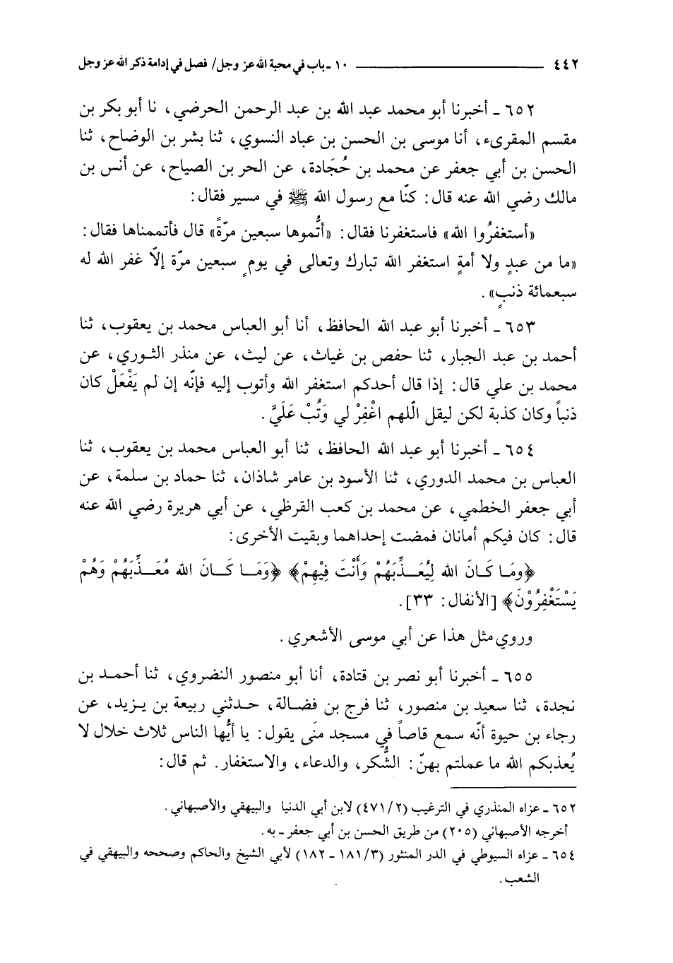 655 - أخبرنا أبو نصر بن قتادة أنا أبو منصور النضروي ثنا أحمد بن نجدة ثنا سعيد بن منصور ثنا فرج بن فضالة حدثني ربيعة بن يزيد عن رجاء بن حيوة : أنه سمع قاصا في مسجد منى يقول : يا أيها الناس ثلاث خلال لا يعذبكم الله ما عملتم بهن : الشكر و الدعاء و الاستغفار ثم قال :
