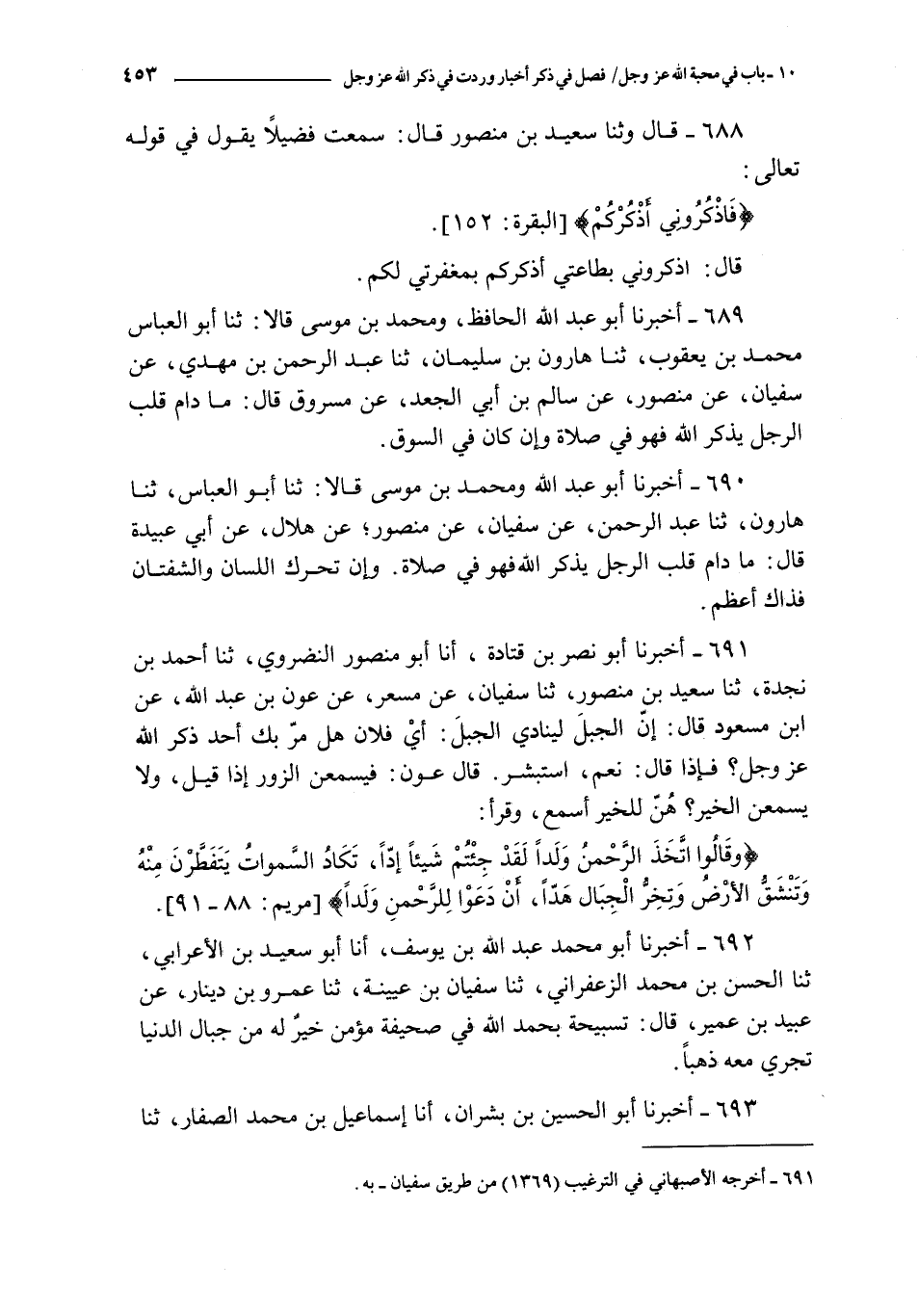 691 - أخبرنا أبو نصر بن قتادة أنا أبو منصور النضروي ثنا أحمد بن نجدة ثنا سعيد بن منصور ثنا سفيان عن مسعر عن عون بن عبد الله عن ابن مسعود قال : إن الجبل لينادي الجبل : أي فلان هل مر بك أحد ذكر الله عز و جل ؟ فإذا قال : نعم استبشر قال عون : فيسمعن الزور إذا قيل و لا يسمعن الخير ؟ هن للخير أسمع و قرأ :