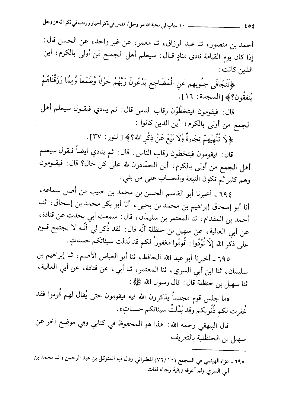 694 - أخبرنا أبو القاسم الحسن بن محمد بن حبيب من أصل سماعه أنا أبو إسحاق إبراهيم بن محمد بن يحيى أنا أبو بكر محمد بن إسحاق ثنا أحمد بن المقدام ثنا المعتمر بن سليمان قال : سمعت أبي يحدث عن قتادة عن أبي العالية عن سهيل بن حنظلة أنه قال : لقد ذكر لي أنه لا يجتمع قوم على ذكر الله إلا نودوا : قوموا مغفورا لكم قد بدلت سيئاتكم حسنات