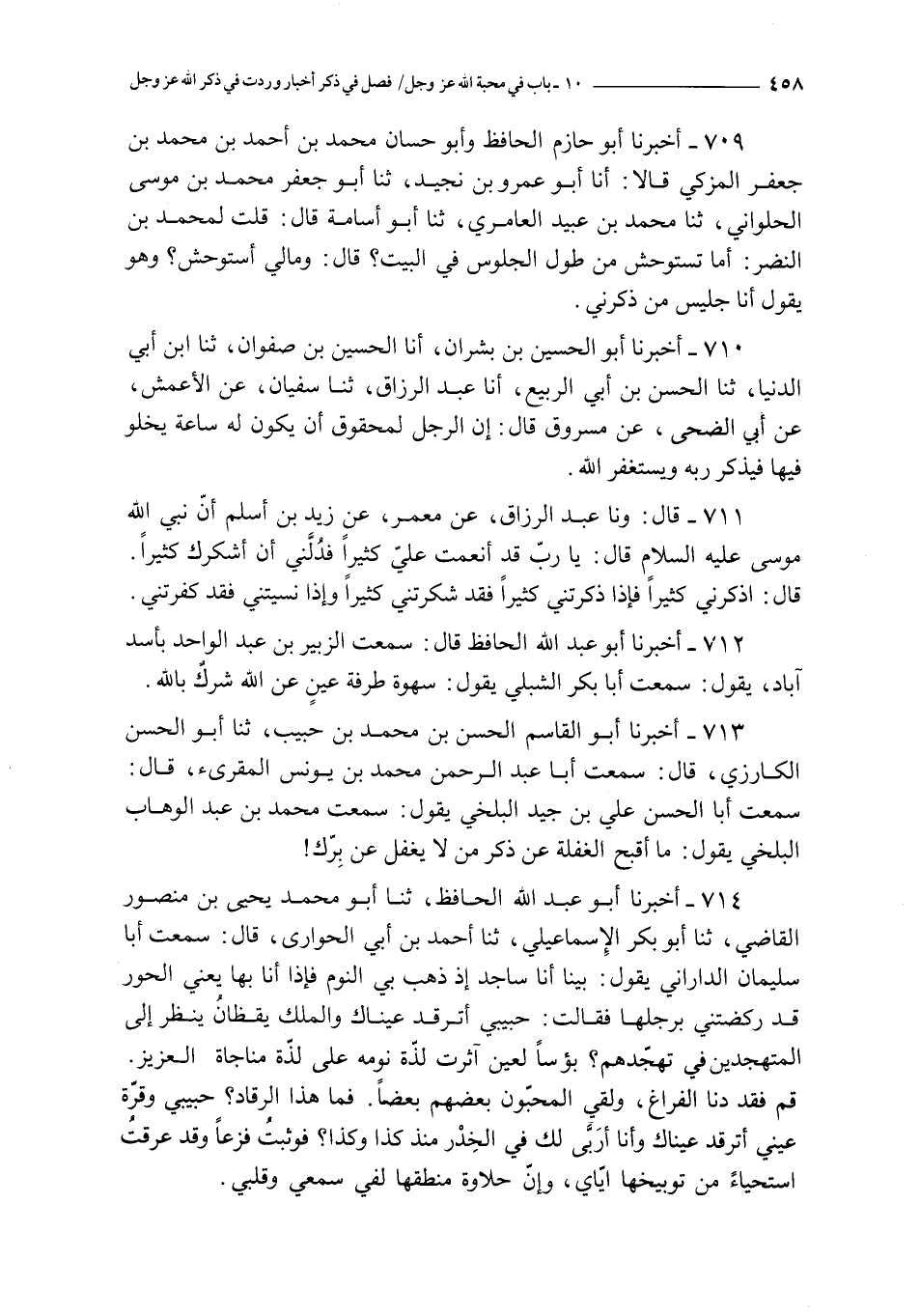 712 - أخبرنا أبو عبد الله الحافظ قال : سمعت الزبير بن عبد الواحد بأسد آباد يقول : سمعت أبا بكر الشبلي يقول : سهوة طرفة عين عن الله شرك بالله