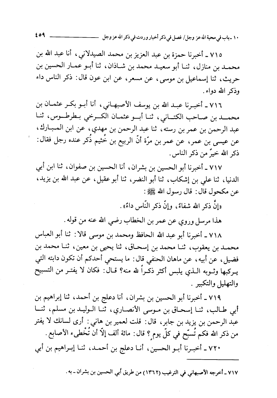 719 - أخبرنا أبو الحسين بن بشران أنا دعلج بن أحمد ثنا إبراهيم بن أبي طالب ثنا إسحاق بن موسى الأنصاري ثنا الوليد بن مسلم ثنا عبد الرحمن بن يزيد بن جابر قال : قلت لعمير بن هاني : أرى لسانك لا يفتر من ذكر الله فكم تسبح في كل يوم ؟ قال : مائة ألف إلا أن تخطئ الأصابع