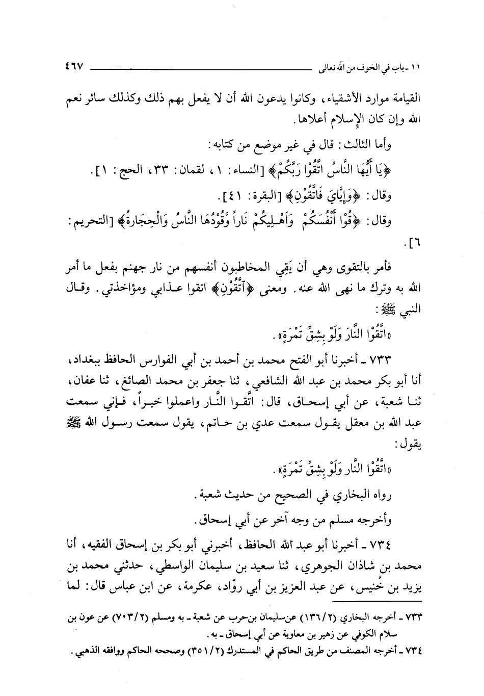 733 - أخبرنا أبو الفتح محمد بن أحمد بن أبي الفوارس الحافز ببغداد أنا أبو بكر محمد بن عبد الله الشافعي ثنا جعفر بن محمد الصائغ ثنا عفان ثنا شعبة عن أبي إسحاق قال : اتقوا النار و اعملوا خيرا فإني سمعت عبد الله بن معقل يقول سمعت عدي بن حاتم يقول سمعت رسول الله صلى الله عليه و سلم يقول :