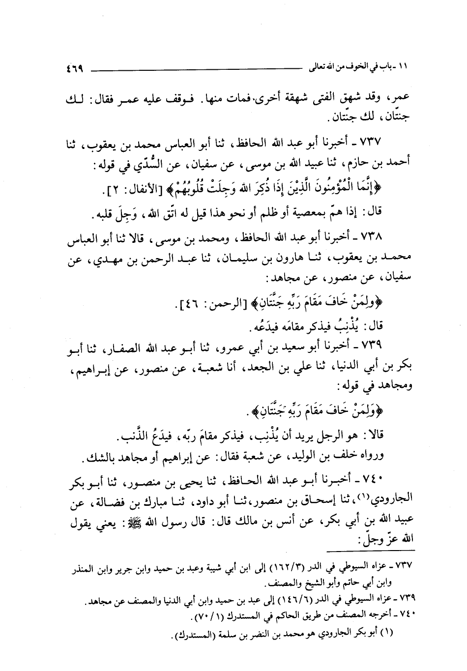738 - أخبرنا أبو عبد الله الحافظ و محمد بن موسى قالا ثنا أبو العباس محمد بن يعقوب ثنا هارون بن سليمان ثنا عبد الرحمن بن مهدي عن سفيان عن منصور عن مجاهد : ـ { و لمن خاف مقام ربه جنتان }