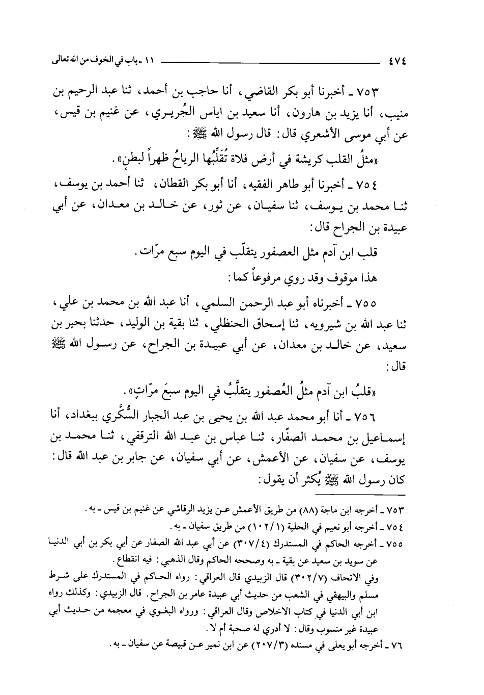 754 - أخبرنا أبو طاهر الفقيه أنا أبو بكر القطان ثنا أحمد بن يوسف ثنا محمد بن يوسف ثنا سفيان عن ثور عن خالد بن معدان عن أبي عبيدة بن الجراح قال : قلب ابن آدم مثل العصفور يتقلب في اليوم سبع مرات