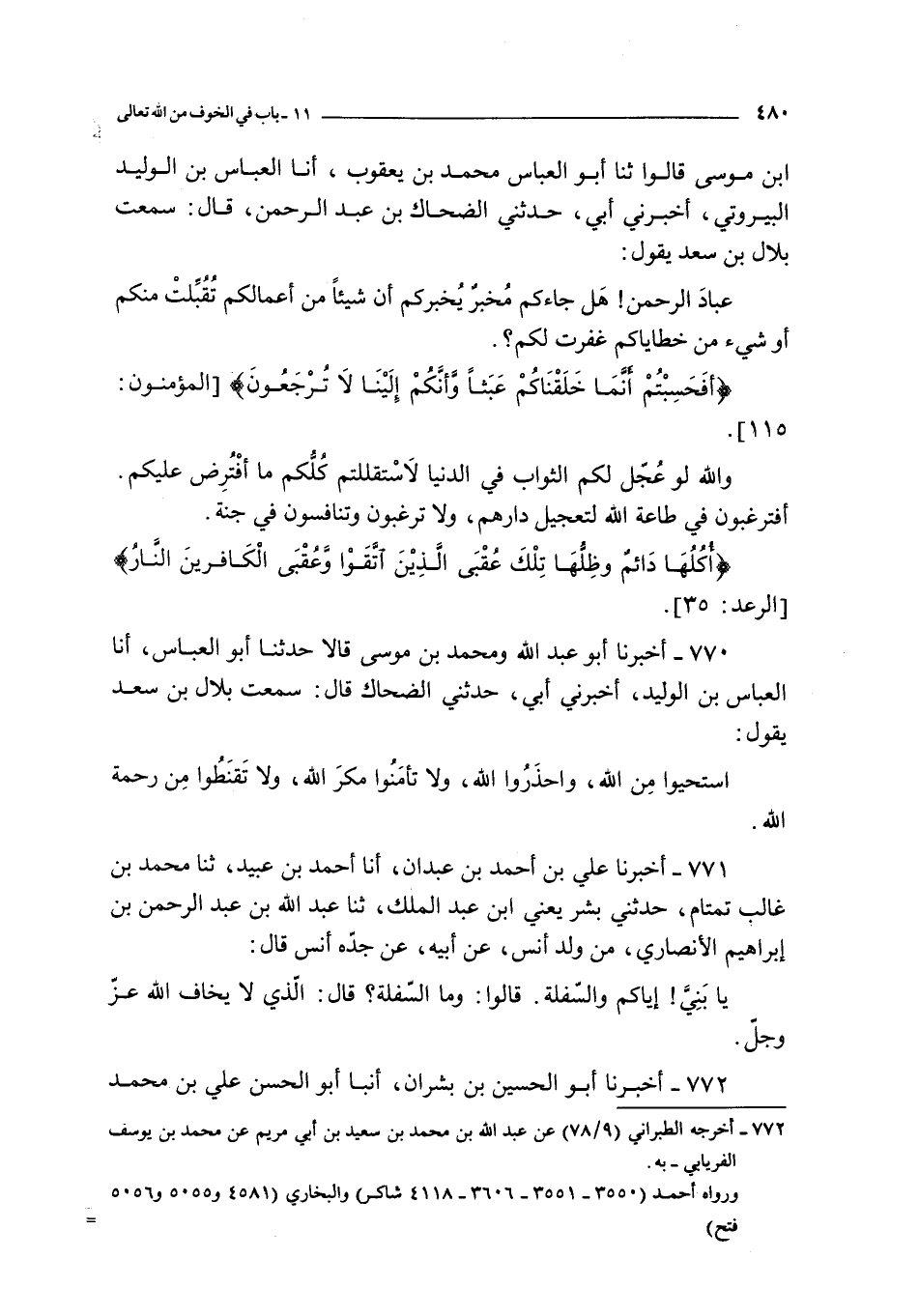 770 - أخبرنا أبو عبد الله و محمد بن موسى قالا حدثنا أبو العباس أنا العباس بن الوليد أخبرني أبي حدثني الضحاك قال : سمعت بلال بن سعد يقول : استحيوا من الله و احذروا الله و لا تأمنوا مكر الله و لا تقنطوا من رحمة الله