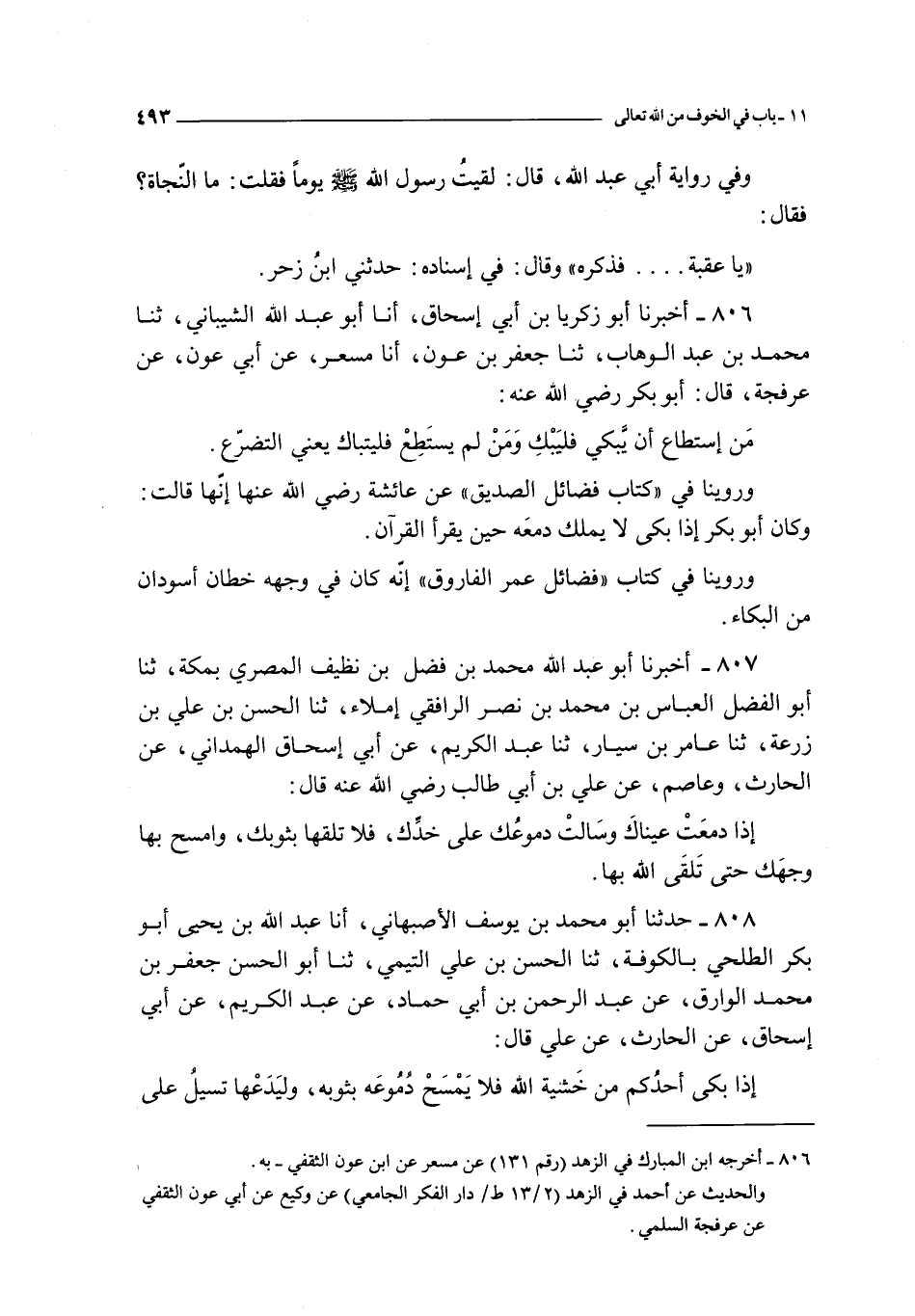 806 - أخبرنا أبو زكريا بن أبي إسحاق أنا أبو عبد الله الشيباني ثنا محمد بن عبد الوهاب ثنا جعفر بن عون أنا مسعر عن أبي عون عن عرفجة قال أبو بكر رضي الله عنه : من استطاع أن يبكي فليبك و من لم يستطع فليتباك يعني التضرع