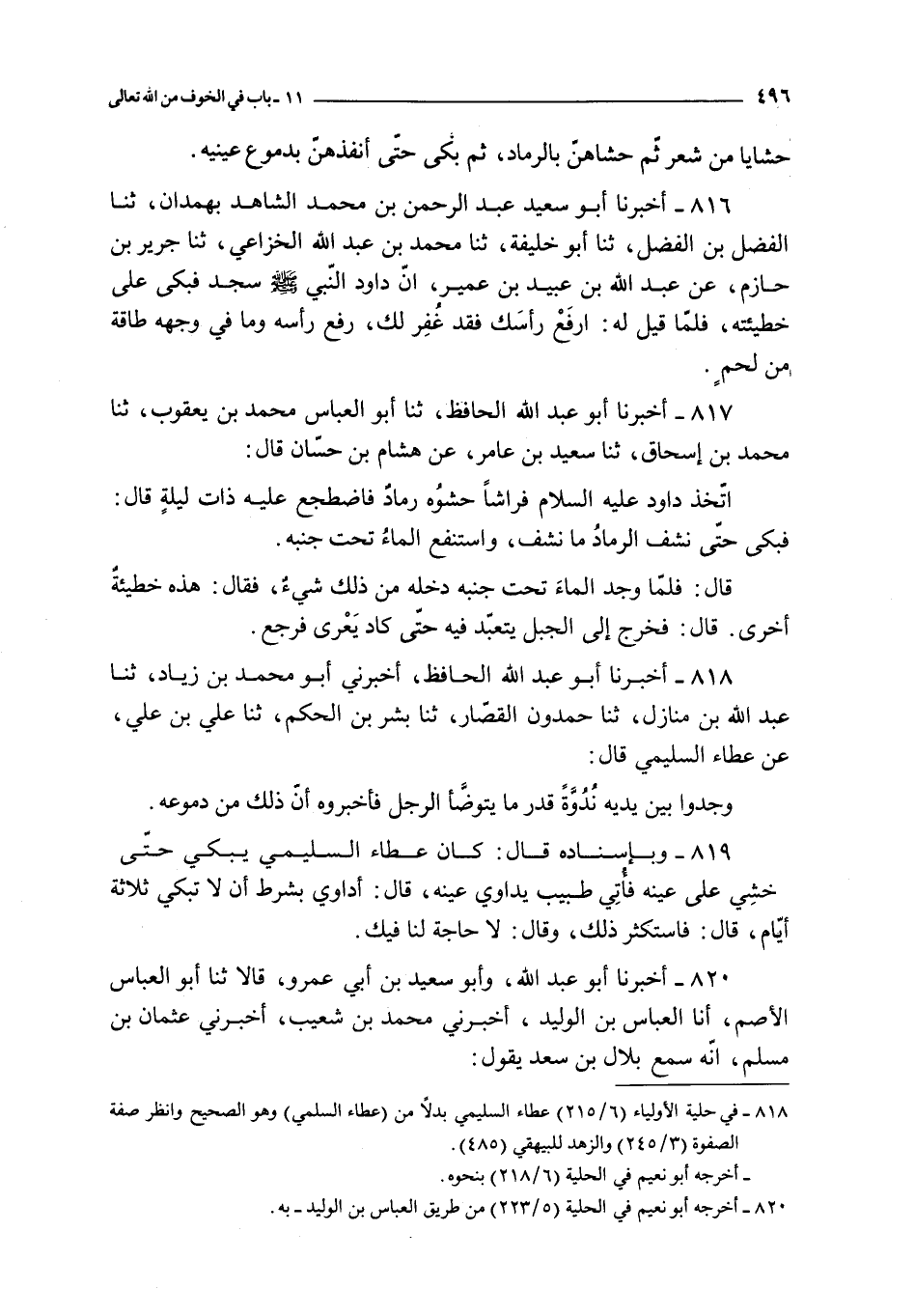 819 - و بإسناده قال : كان عطاء السليمي يبكي حتى خشي على عينه فأتي طبيب يداوي عينه قال : أداوي بشرط أن لا تبكي ثلاثة أيام قال : فاستكثر ذلك و قال : لا حاجة لنا فيك