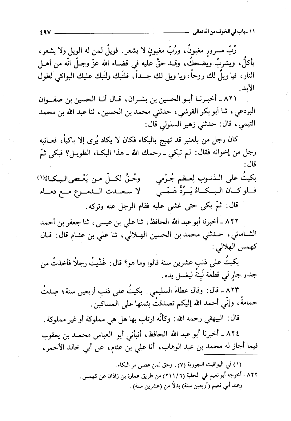 821 - أخبرنا أبو الحسين بن بشران قال أنا الحسين بن صفوان البردعي ثنا أبو بكر القرشي حدثني محمد بن الحسين ثنا عبد الله بن محمد التيمي قال : حدثني زهير السلولي قال : كان رجل من بلعنبر قد تهيج بالبكاء فكان لا يكاد يرى إلا باكيا فعاتبه رجل من إخوانه فقال : لم تبكي ـ رحمك الله ـ هذا البكاء الطويل ؟ فبكى ثم قال :