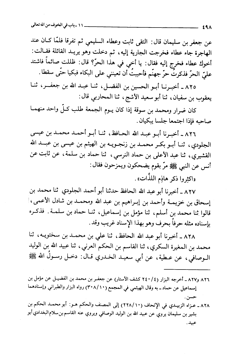 826 - أخبرنا أبو عبد الله الحافظ ثنا أبو أحمد محمد بن عيسى الجلودي ثنا أبو بكر بن زنجويه بن الهيثم بن عيسى بن عبد الله القشيري ثنا عبد الأعلى بن حماد النرسي ثنا حماد بن سلمة عن ثابت عن أنس : عن النبي صلى الله عليه و سلم مر بقوم يضحكون و يمزحون فقال :