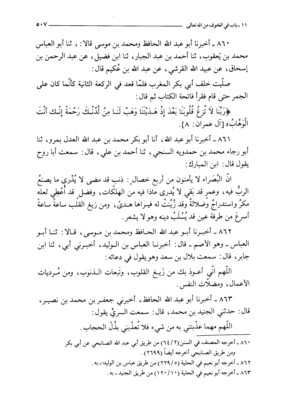 862 - أخبرنا أبو عبد الله الحافظ و محمد بن موسى قالا : ثنا أبو العباس ـ و هو الأصم ـ قال : أخبرنا العباس بن الوليد أخبرني أبي ثنا ابن جابر قال : سمعت بلال بن سعد و هو يقول في دعائه : اللهم إني أعوذ بك من زيغ القلوب و تبعات الذنوب و من مرديات الأعمال و مضلات النفس