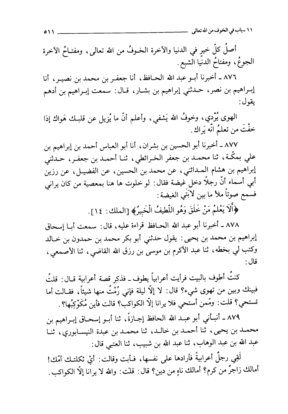 878 - أخبرنا أبو عبد الله الحافظ قراءة عليه قال : سمعت أبا إسحاق سليمان بن محمد بن يحيى : يقول حدثني أبو بكر محمد بن حمدون بن خالد و كتب لي بخطه ثنا عبد الأكرم بن موسى بن رزق الله القاضي ثنا الأصمعي قال : كنت أطوف بالبيت فرأيت أعرابيا يطوف ـ فذكر قصة أعرابية قال : قلت فبينك و بين من تهوى شيء ؟ قال : لا إلا ليلة فإني رمت منها شيئا فقالت أما تستحي ؟ قلت : و من أستحي فلا يرانا إلا الكواكب ؟ قالت فأين مكوكبها ؟