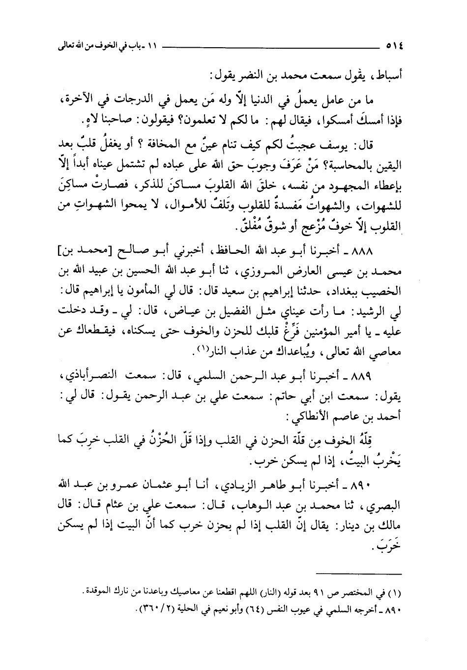 889 - أخبرنا أبو عبد الرحمن السلمي قال : سمعت النصر أباذي يقول : سمعت ابن أبي حاتم : سمعت علي بن عبد الرحمن يقول : قال لي : أحمد بن عاصم الأنطاكي : قلة الخوف من قلة الحزن في القلب و إذا قل الحزن خرب كما يخرب البيت إذا لم يسكن خرب