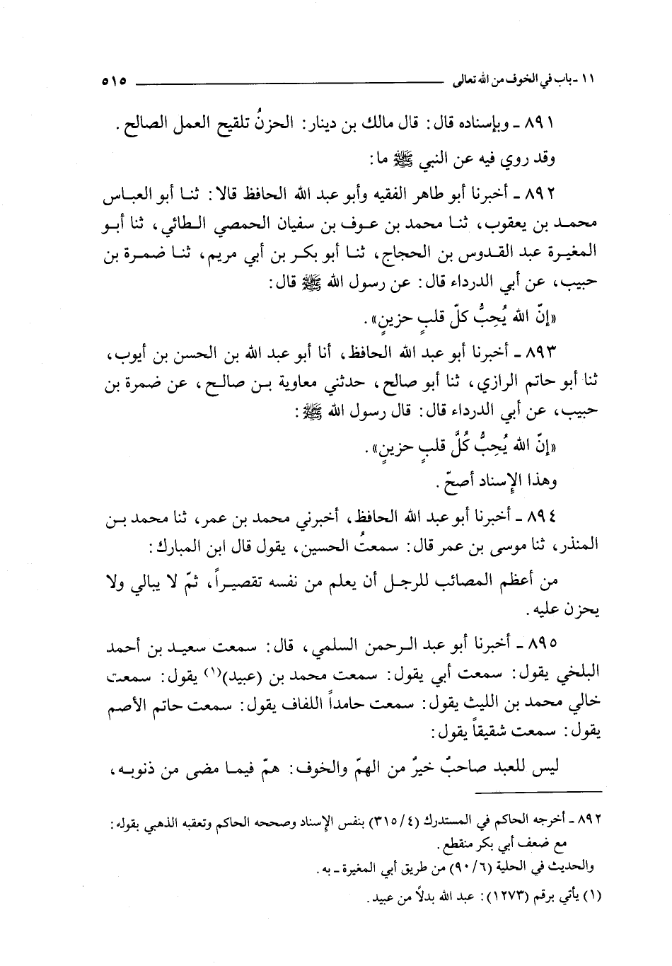 895 - أخبرنا أبو عبد الرحمن السلمي قال : سمعت سعيد بن أحمد البلخي يقول : سمعت أبي يقول : سمعت محمد بن عبيد يقول : سمعت خالي محمد بن الليث يقول : سمعت حامدا اللفاف يقول : سمعت حاتم الأصم يقول : سمعت شقيقا يقول : ليس للعبد صاحب خير من الهم و الخوف : هم فيما مضى من ذنوبه و خوف فيما لا يدري ما ينزل به