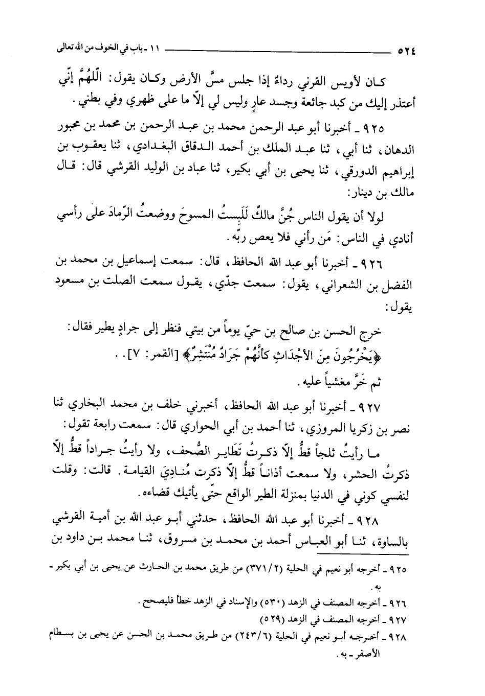 925 - أخبرنا أبو عبد الرحمن محمد بن عبد الرحمن بن محمد بن محبور الدهان ثنا أبي ثنا عبد الملك بن أحمد الدقاق البغدادي ثنا يعقوب بن إبراهيم الدورقي ثنا يحيى بن أبي بكير ثنا عباد بن الوليد القرشي قال : قال مالك بن دينار : لولا أن يقول الناس جن مالك للبست المسوح و وضعت الرماد على رأسي أنادي في الناس : من رأني فلا يعص ربه