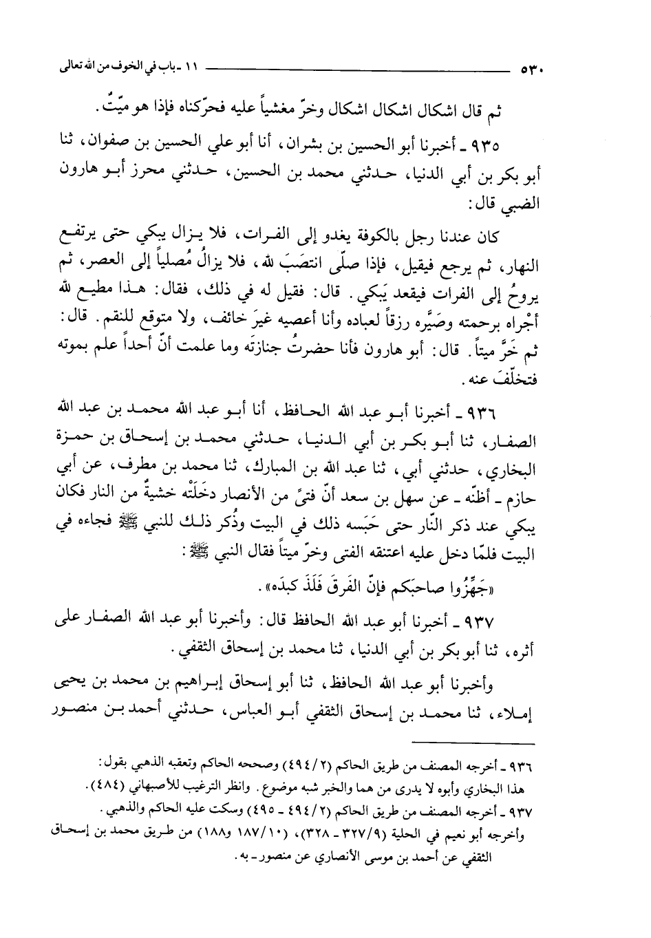 936 - أخبرنا أبو عبد الله الحافظ أنا أبو عبد الله محمد بن عبد الله الصفار ثنا أبو بكر بن أبي الدنيا حدثني محمد بن إسحاق بن حمزة البخاري حدثني أبي ثنا عبد الله بن المبارك ثنا محمد بن مطرف عن أبي حازم ـ أظنه ـ عن سهل بن سعد : أن فتى من الأنصار دخلته خشية من النار فكان يبكي عند ذكر النار حتى حبسه ذلك في البيت و ذكر ذلك للنبي صلى الله عليه و سلم فجاءه في البيت فلما دخل عليه اعتنقه الفتى و خر ميتا فقال النبي صلى الله عليه و سلم :