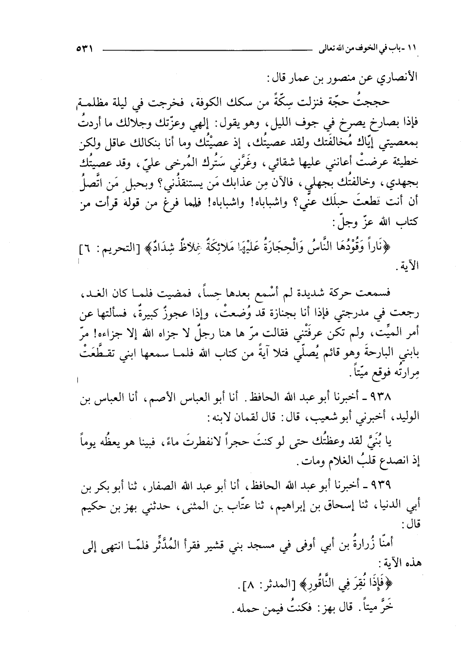 939 - أخبرنا أبو عبد الله الحافظ أنا أبو عبد الله الصفار ثنا أبو بكر بن أبي الدنيا ثنا إسحاق بن إبراهيم ثنا عتاب بن المثنى حدثني بهز بن حكيم قال : أمنا زرارة بن أبي أوفى في مسجد بني قشير فقرأ المدثر فلما انتهى إلى هذه الآية :