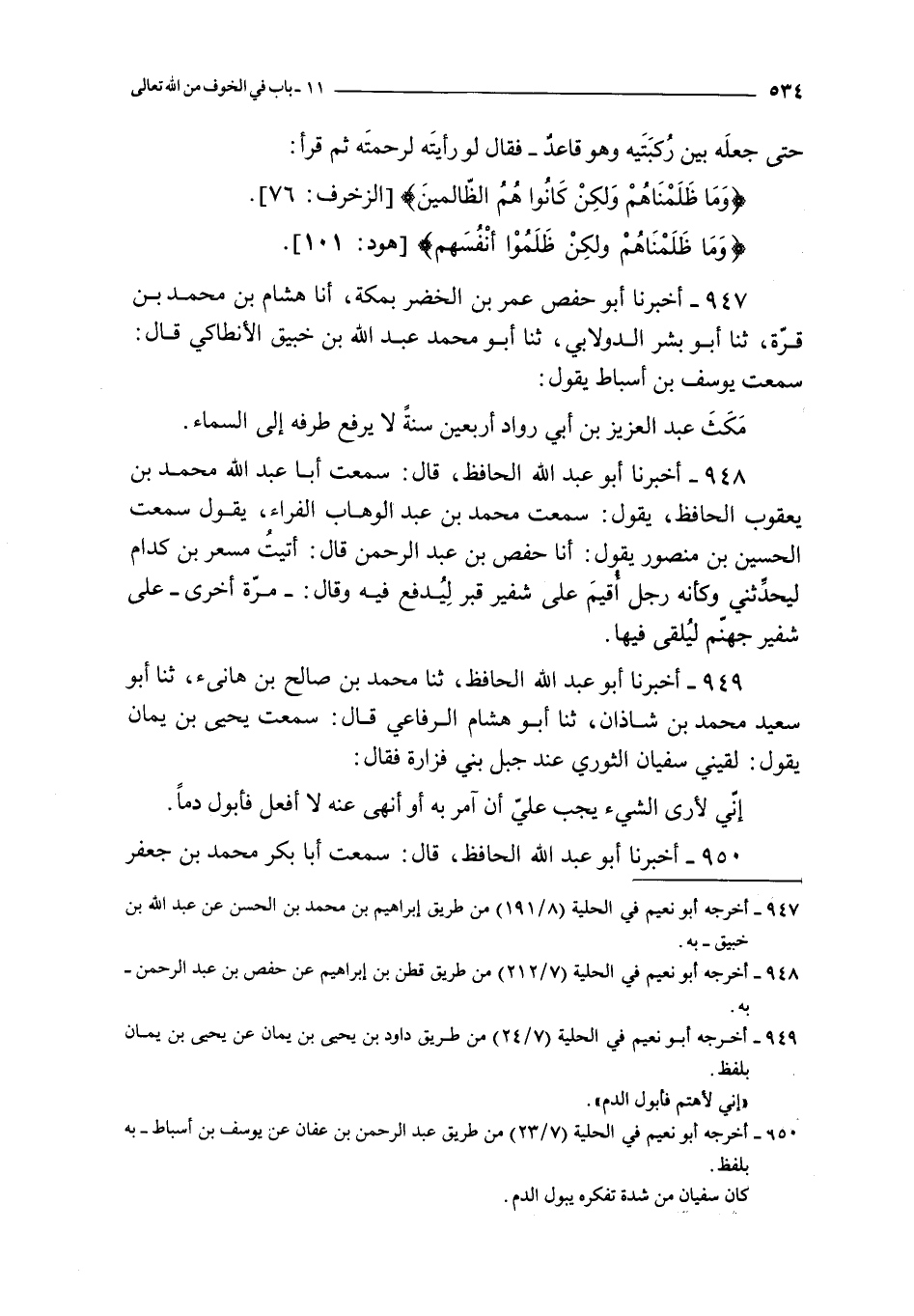 950 - أخبرنا أبو عبد الله الحافظ قال : سمعت أبا بكر محمد بن جعفر ابن يزيد الآدمي القارئ ببغداد يقول : سمعت أبا العيناء محمد بن القاسم يقول : سمعت عبد الله بن خبيق يقول : قال : يوسف بن أسباط : كان سفيان الثوري إذا أخذ من ذكر الآخرة يبول الدم