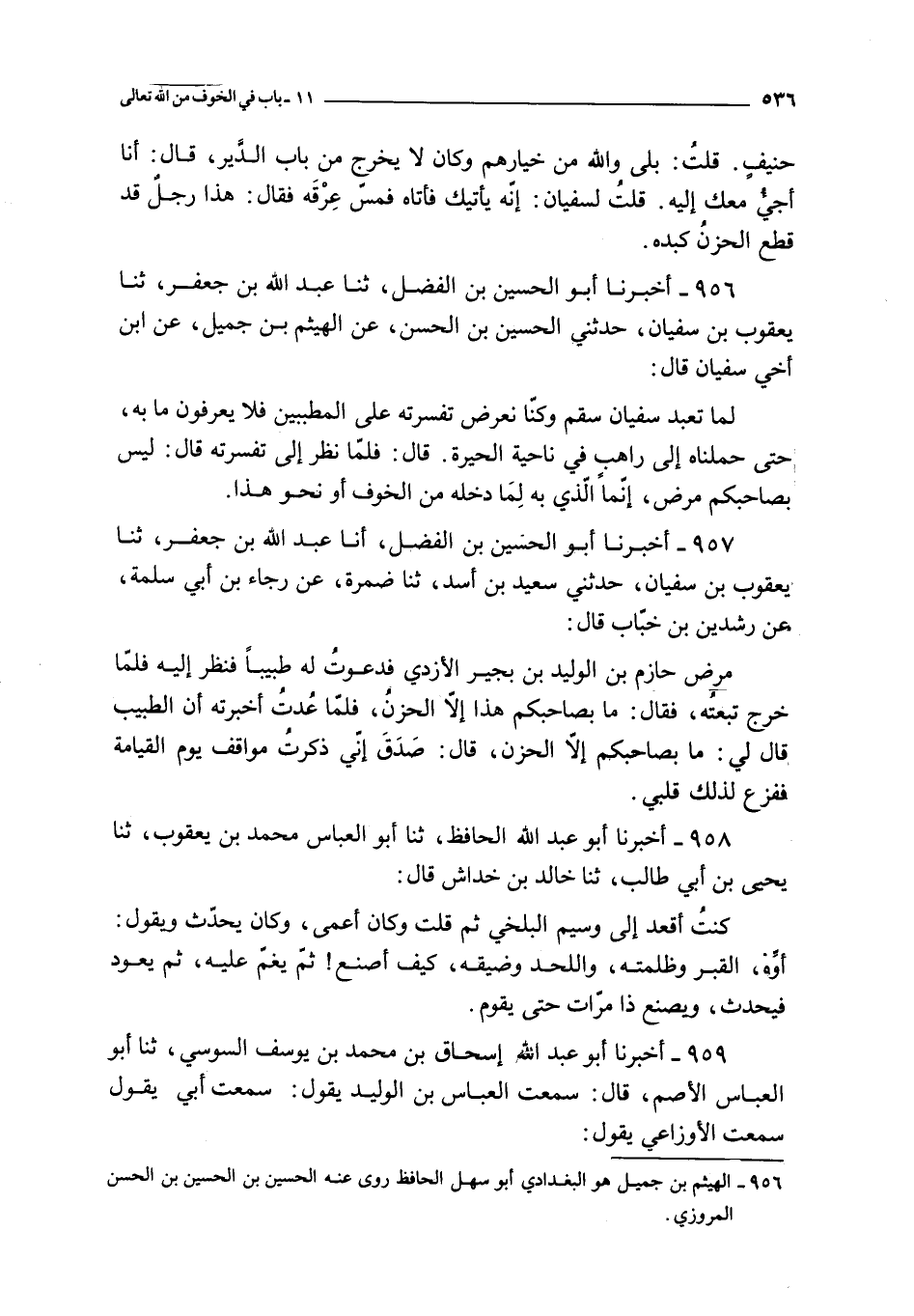 956 - أخبرنا أبو الحسين بن الفضل ثنا عبد الله بن جعفر ثنا يعقوب بن سفيان حدثني الحسين بن الحسن عن الهيثم بن جميل عن ابن أخي سفيان قال : لما تعبد سفيان سقم و كنا نعرض تفسرته على المطببين فلا يعرفون ما به حتى حملناه إلى راهب في ناحية الحيرة قال : فلما نظر إلى تفسرته قال : ليس بصاحبكم مرض إنما الذي به لما دخله من الخوف أو نحو هذا