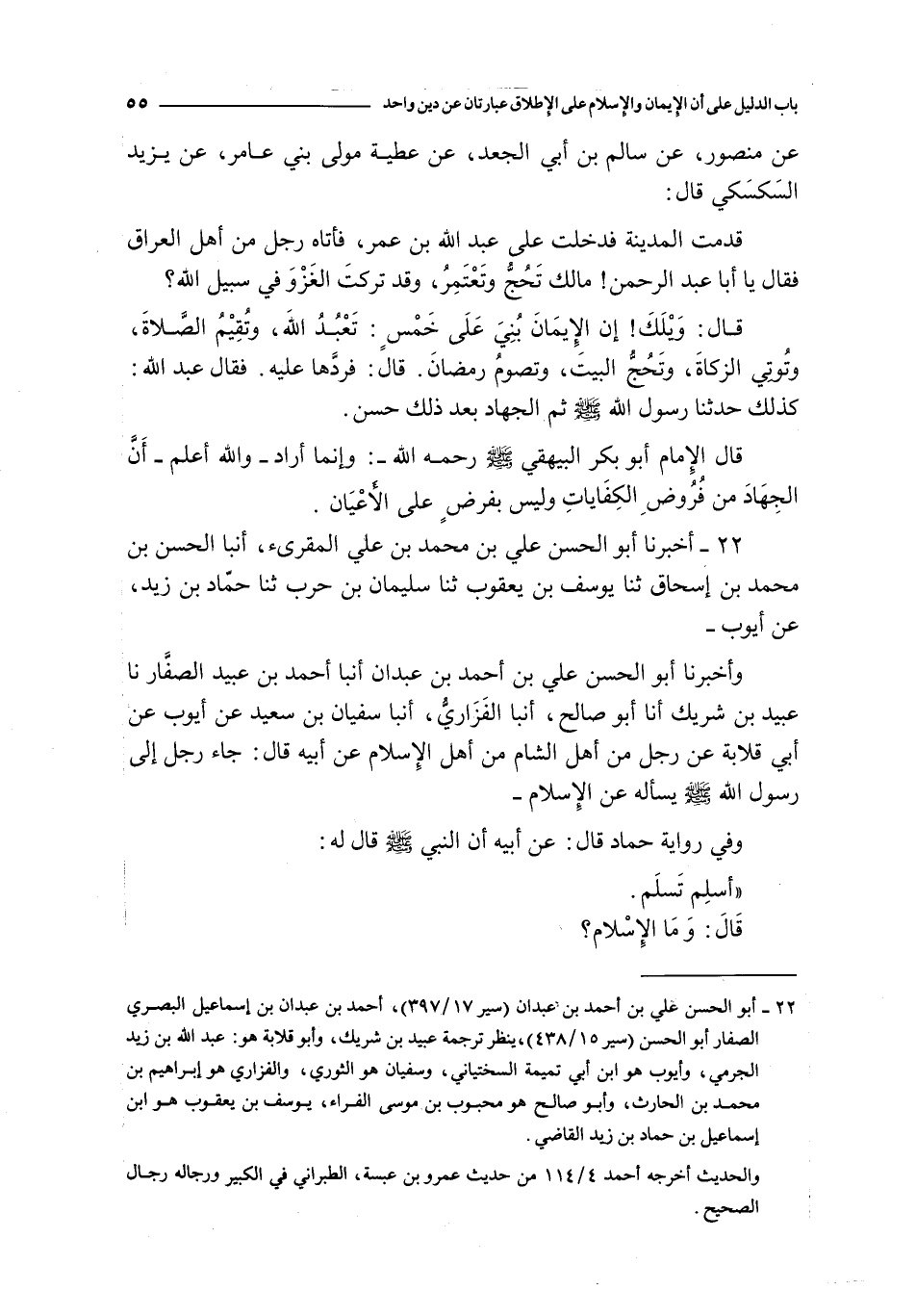 و أخبرنا أبو الحسن علي بن أحمد بن عبدان أنبأ أحمد بن عبيد الصفار نا عبيد بن شريك أنا أبو صالح أنبأ الفزاري أنبأ سفيان بن سعيد عن أيوب عن أبي قلابة عن رجل من أهل الشام من أهل الإسلام عن أبيه قال : جاء رجل إلى رسول الله صلى الله عليه و سلم يسأله عن الإسلام ـ و في رواية حماد قال : عن أبيه أن النبي صلى الله عليه و سلم قال له :
