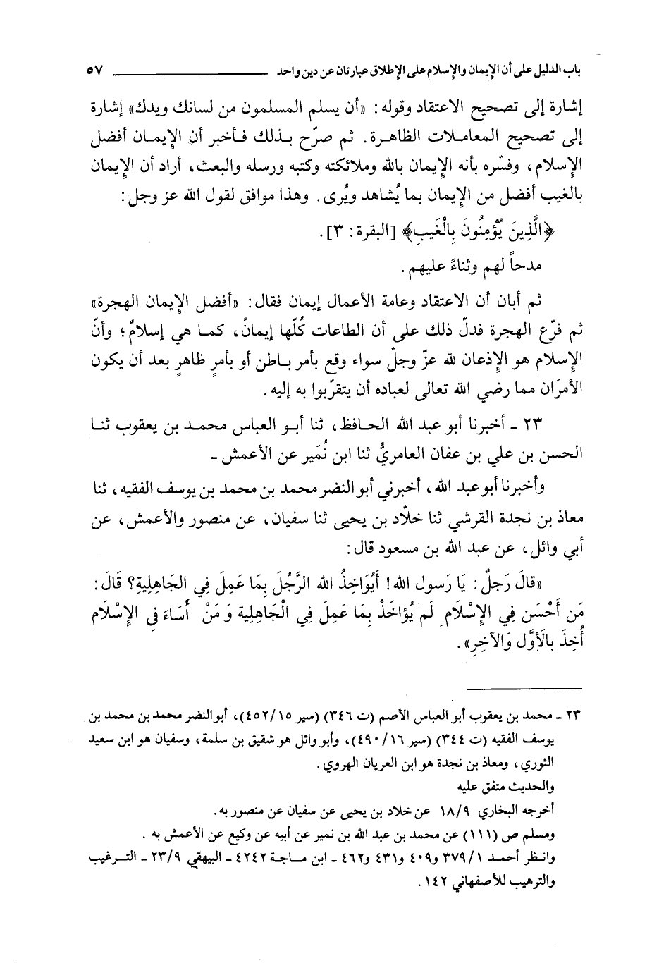 و أخبرنا أبو عبد الله أخبرني أبو النضر محمد بن محمد بن يوسف الفقيه ثنا معاذ بن نجدة القرشي ثنا خلاد بن يحيى ثنا سفيان عن منصور و الأعمش عن أبي وائل عن عبد الله بن مسعود قال : قال رجل : يا رسول الله ! أيؤاخذ الله الرجل بما عمل في الجاهلية ؟ قال : من أحسن في الإسلام لم يؤاخذ بما عمل في الجاهلية و من أساء في الإسلام أخذ بالأول و الآخر