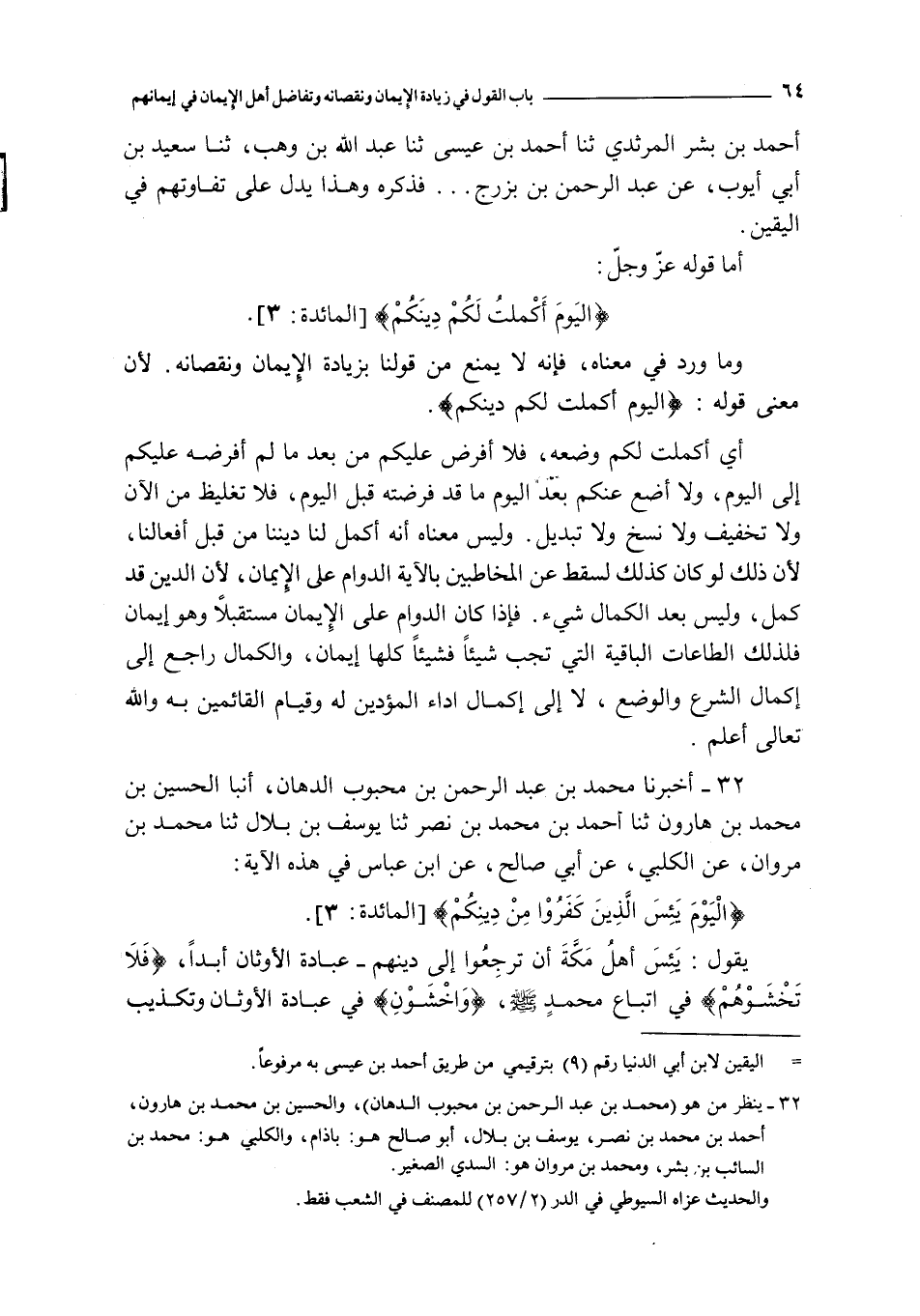 32 - أخبرنا محمد بن عبد الرحمن بن محبوب الدهان أنبأ الحسين محمد بن هارون ثنا أحمد بن محمد بن نصر حدثنا يوسف بن بلال ثنا محمد بن مروان عن الكلبي عن أبي صالح عن ابن عباس : في هذه الآية : { اليوم يئس الذين كفروا من دينكم }