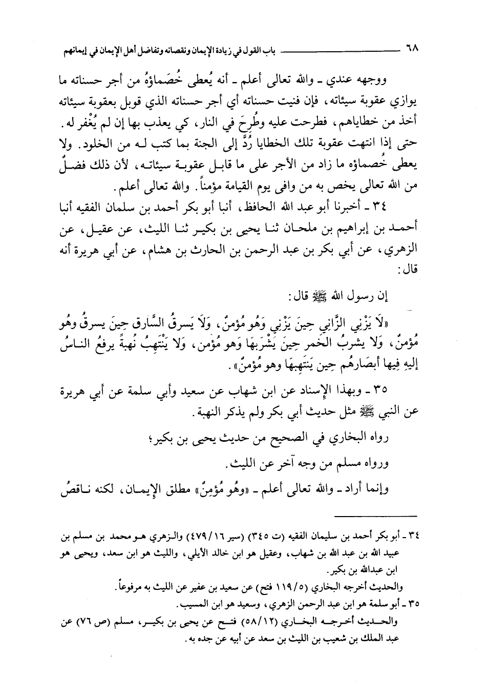 و ذكر الحليمي ـ رحمه الله تعالى ـ ها هنا آثار تدل على أن الطاعات من الإيمان و إن الإيمان يزيد و ينقص و أن أهل الإيمان يتفاضلون في الإيمان و نحن قد ذكرناها في كتاب الإيمان و نشير إلى طرق منها ها هنا بمشيئة الله عز و جل