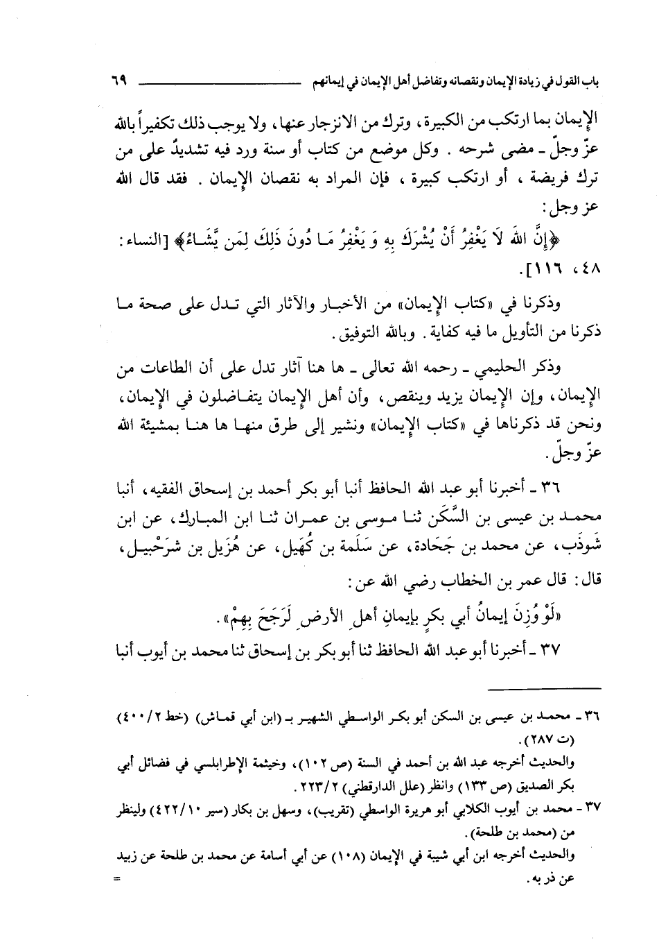 37 - أخبرنا أبو عبد الله الحافظ ثنا أبو بكر بن إسحاق ثنا محمد بن أيوب أنبأ سهل بن بكار عن محمد بن طلحة عن زبيد عن ذر قال : كان عمر بن الخطاب رضي الله عنه ربما أخذ بيد الرجل و الرجلين يقول : تعالوا نزداد إيمانا