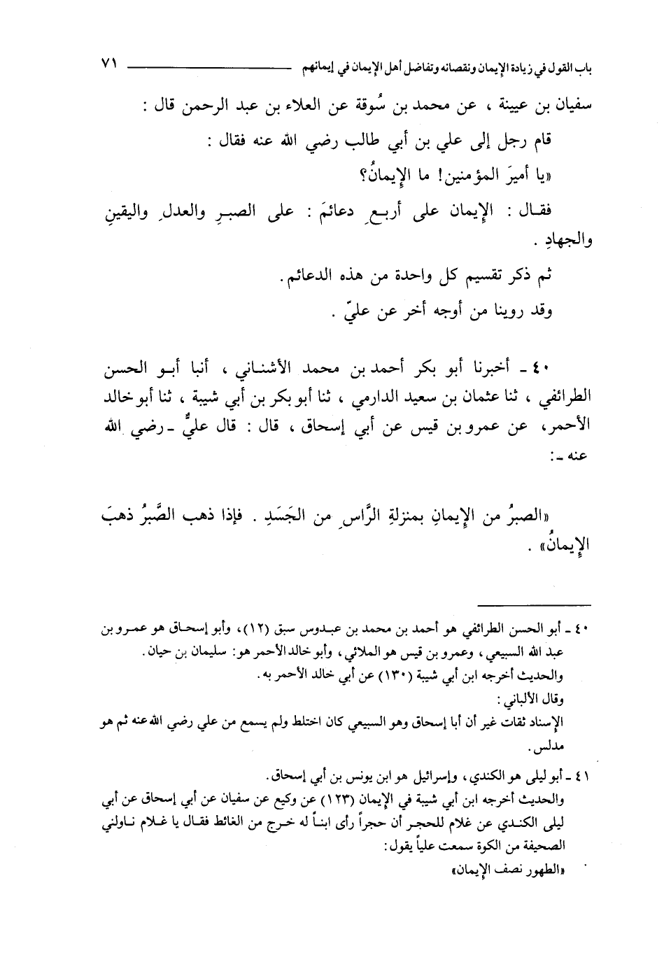40 - أخبرنا أبو بكر أحمد بن محمد الأشناني أنبأ أبو الحسن الطرائفي ثنا عثمان بن سعيد الدارمي ثنا أبو بكر بن أبي شيبة ثنا أبو خالد الأحمر عن عمرو بن قيس عن أبي إسحاق قال : قال علي رضي الله عنه : الصبر من الإيمان بمنزلة الرأس من الجسد فإذا ذهب الصبر ذهب الإيمان
