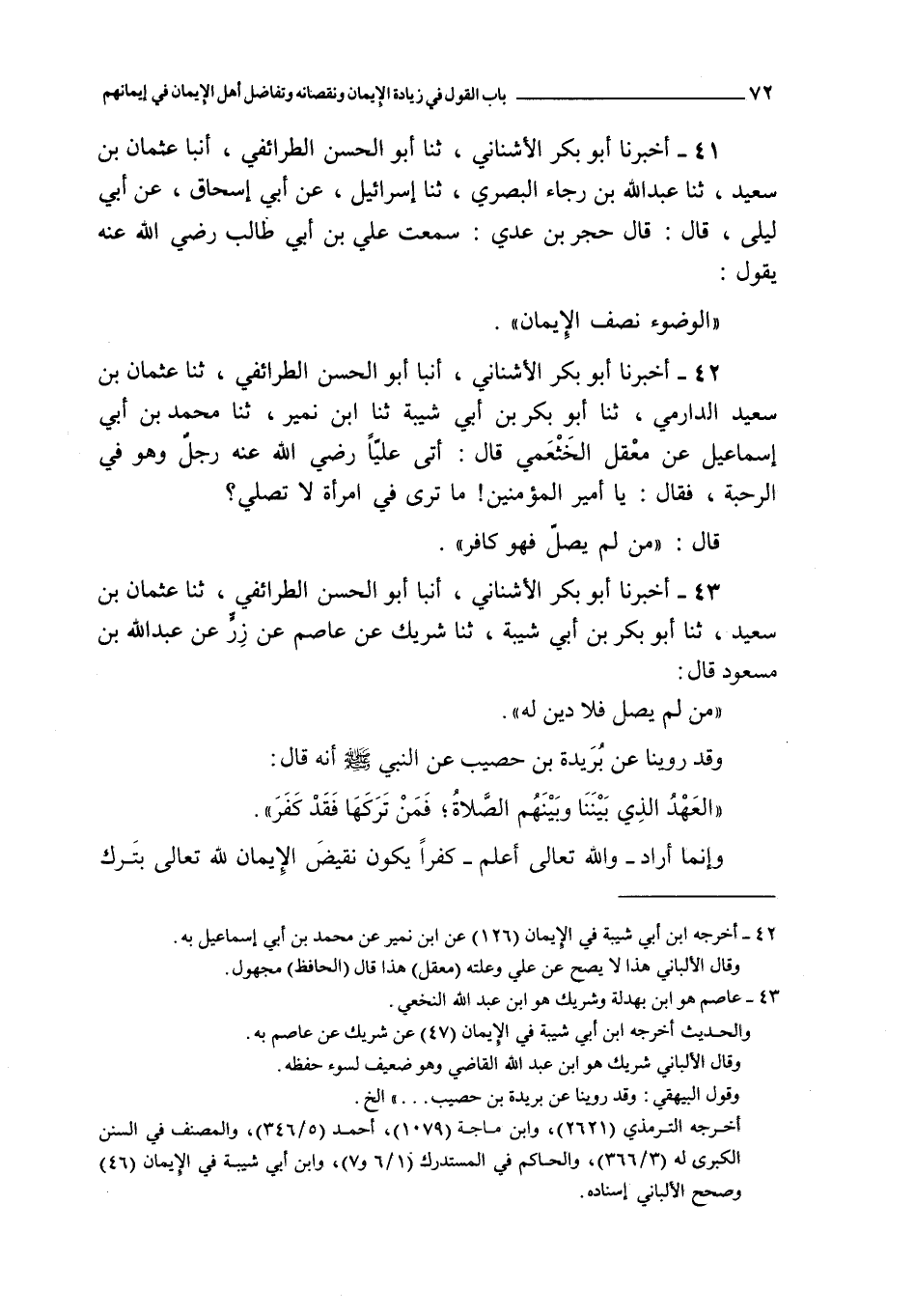 41 - أخبرنا أبو بكر الأشناني ثنا أبو الحسن الطرائفي أنبأ عثمان بن سعيد ثنا عبد الله بن رجاء البصري ثنا إسرائيل عن أبي إسحاق عن أبي ليلى قال : قال : حجر بن عدي : سمعت علي بن أبي طالب رضي الله عنه يقول : الوضوء نصف الإيمان