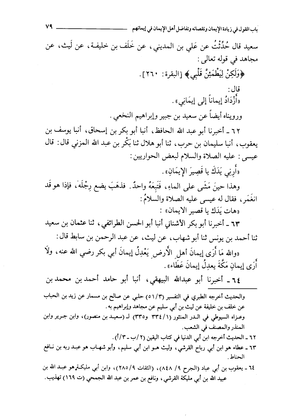 64 - أخبرنا أبو عبد الله البيهقي أنبأ أبو حامد أحمد بن محمد بن الحسين البيهقي حدثنا داود بن الحسين البيهقي حدثنا حميد بن زنجويه ثنا يعقوب بن إسحاق بن أبي عباد ثنا نافع بن عمر قال : قيل لابن أبي مليكة إنه يجالسك رجل يزعم أن إيمانه مثل إيمان جبريل عليه السلام