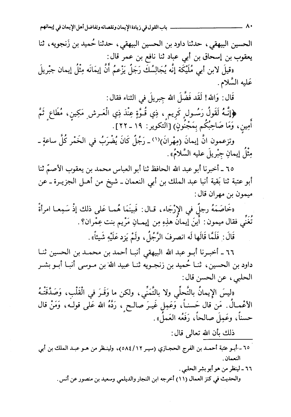 66 - أخبرنا أبو عبد الله البيهقي أنبأ أحمد بن محمد بن الحسين ثنا داود بن الحسين ثنا حميد بن زنجويه ثنا عبيد الله بن موسى أنبأ أبو البشر الحلبي عن الحسن قال : ليس الإيمان بالتحلي و لا بالتمني و لكن ما وقر في القلب و صدقته الأعمال و من قال حسنا و عمل غير صالح رده الله على قوله و من قال حسنا و عمل صالحا رفعه العمل
