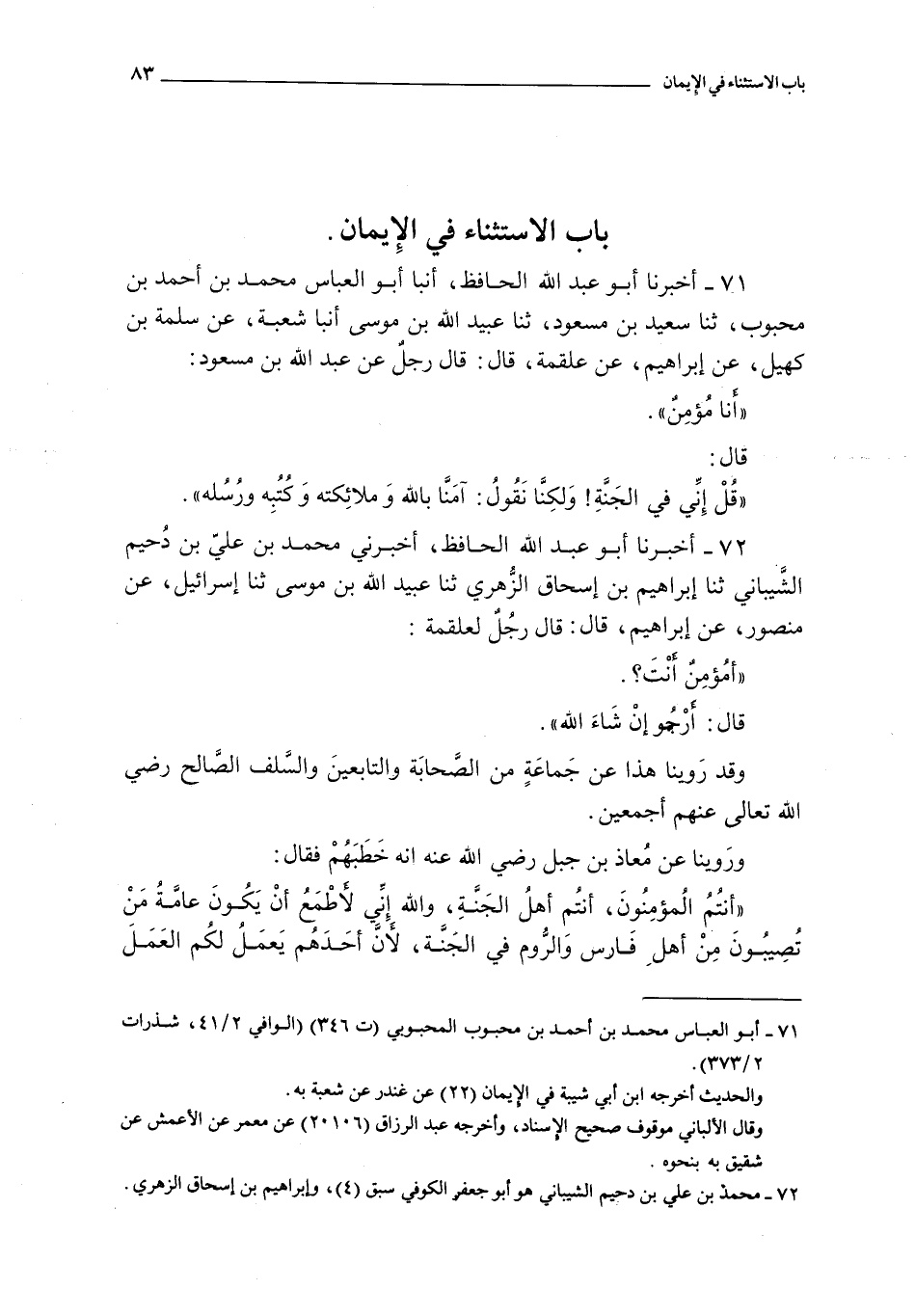 71 - أخبرنا أبو عبد الله الحافظ أنبأ أبو العباس محمد بن أحمد بن محبوب ثنا سعيد بن مسعود ثنا عبيد الله بن موسى أنبأ شعبة عن سلمة بن كهيل عن إبراهيم عن علقمة قال : قال رجل عن عبد الله بن مسعود : أنا مؤمن