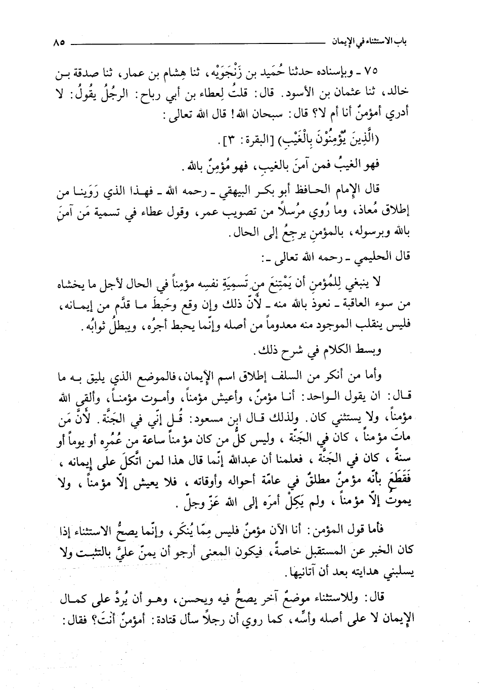 و أما من أنكر من السلف إطلاق اسم الإيمان فالموضع الذي يليق به ما قال : أن يقول الواحد : أنا مؤمن و أعيش مؤمنا و أموت مؤمنا و ألقى الله مؤمنا و لا يستثني كان و لذلك قال ابن مسعود : قل إني في الجنة لأن من مات مؤمنا كان في الجنة و ليس كل من كان مؤمنا ساعة من عمره أو يوما أو سنة كان في الجنة فعلمنا أن عبد الله إنما قال هذا لمن اتكل على إيمانه فقطع بأنه مؤمن مطلق في عامة أحواله و أوقاته فلا يعيش إلا مؤمنا و لا يموت إلا مؤمنا و لم يكل أمره إلى الله عز و جل