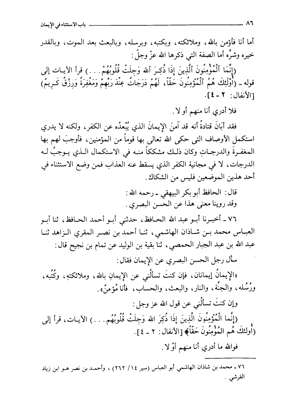 76 - أخبرنا أبو عبد الله الحافظ حدثني أبو أحمد الحافظ ثنا أبو العباس محمد بن شاذان الهاشمي ثنا أحمد بن نصر المقري الزاهد ثنا عبد الله بن عبد الجبار الحمصي ثنا بقية بن الوليد عن تمام بن نجيح قال : سأل رجل الحسن البصري عن الإيمان فقال :