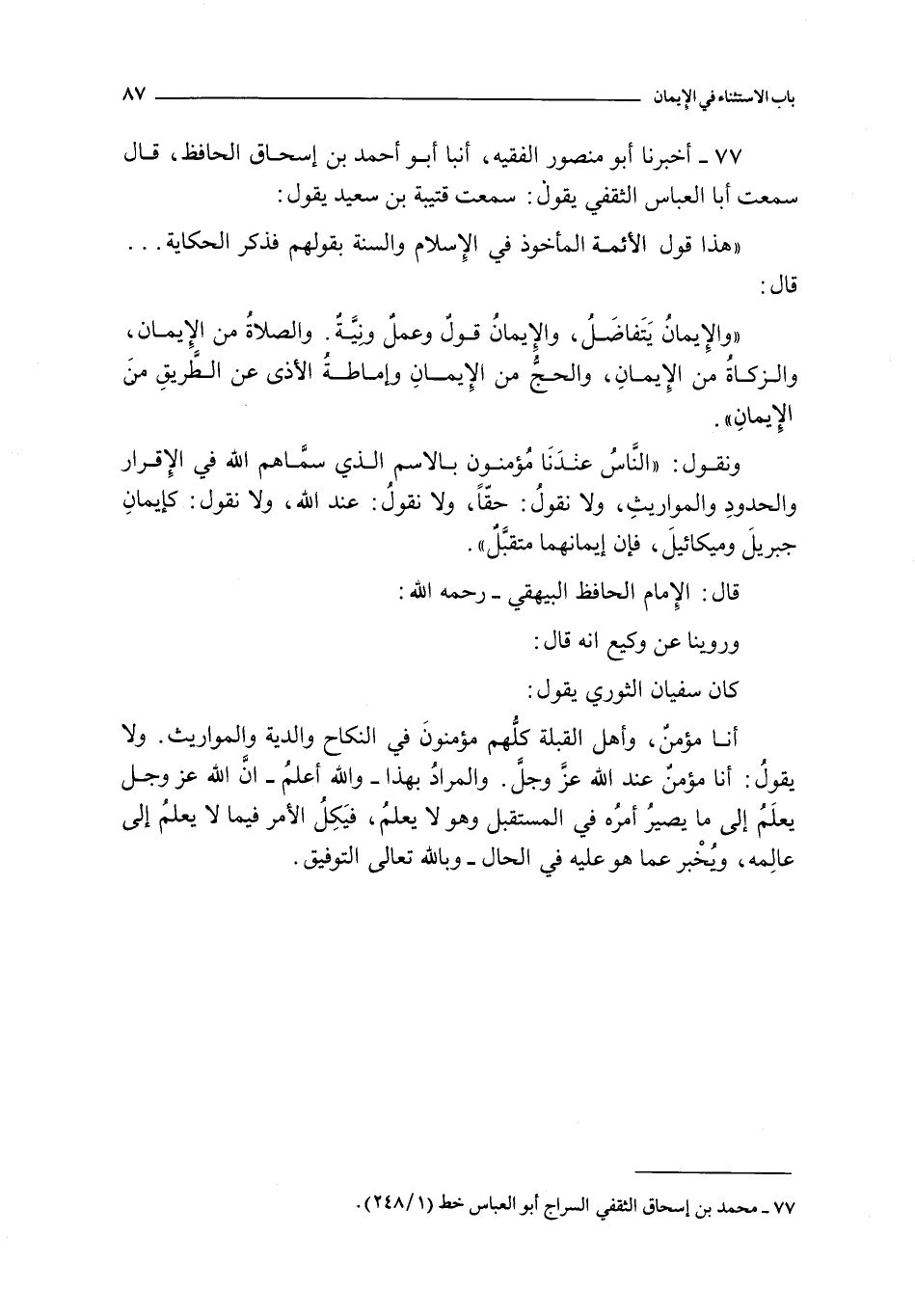77 - أخبرنا أبو منصور الفقيه أنبأ أبو أحمد بن إسحاق الحافظ قال سمعت أبا العباس الثقفي يقول : سمعت قتيبة بن سعيد يقول : هذا قول الأئمة المؤخوذ في الإسلام و السنة بقولهم فذكر الحكاية قال :