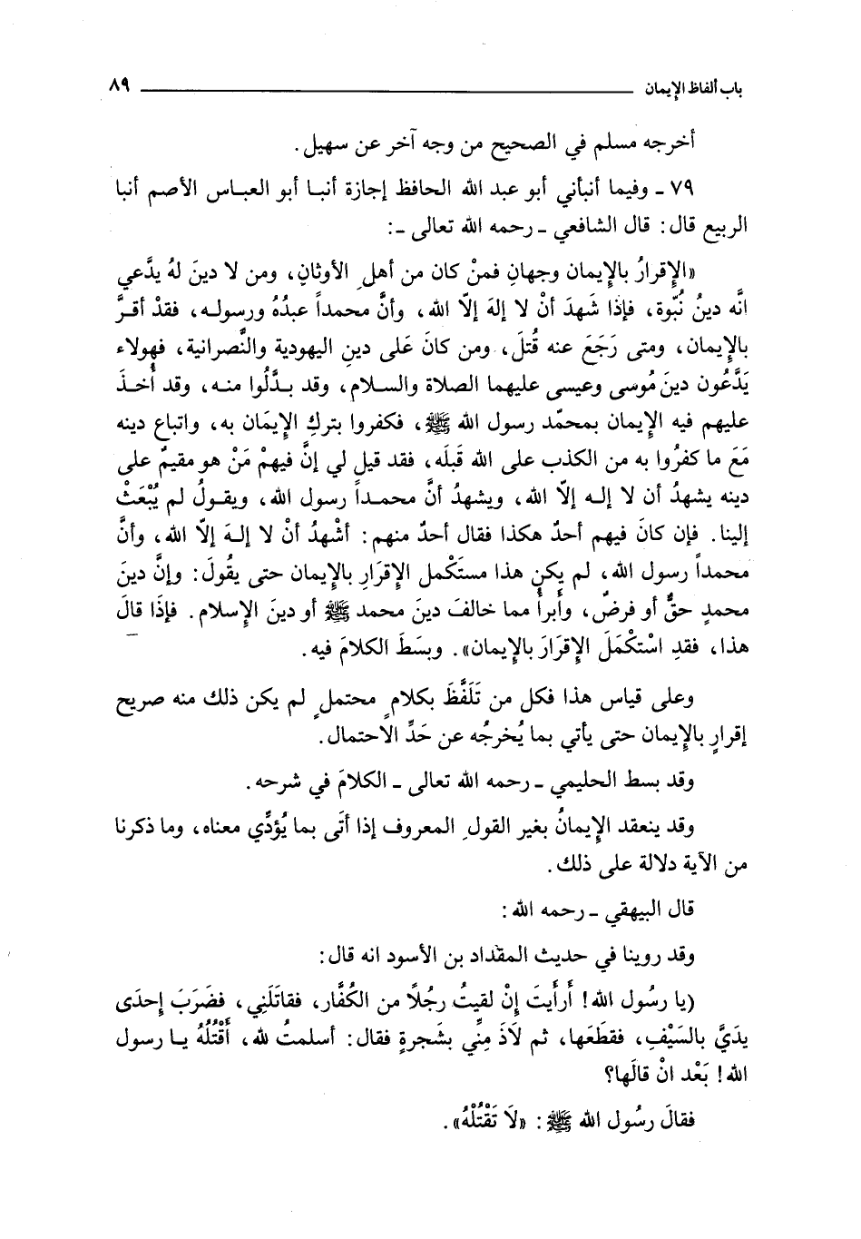 79 - و فيما أنبأني أبو عبد الله الحافظ إجازة أنبأ أبو العباس الأصم أنبأ الربيع قال : قال الشافعي ـ رحمه الله تعالى ـ : الإقرار بالإيمان وجهان فمن كان من أهل الأوثان و من لا دين له يدعي أنه دين نبوة فإذا شهد أن لا إله إلا الله و أن محمدا عبده و رسوله فقد أقر بالإيمان و متى رجع عنه قتل و من كان على دين اليهودية و النصرانية فهؤلاء يدعو دين موسى و عيسى عليهما الصلاة و السلام و قد بدلوا منه و قد أخذ عليهم فيه الإيمان بمحمد رسول الله صلى الله عليه و سلم فكفروا بترك الإيمان به و اتباع دينه مع ما كفروا به من الكذب على الله قبله فقد قيل لي إن فيهم من هو مقيم على دينه يشهد أن لا إله إلا الله و يشهد أن محمدا رسول الله و يقول لم يبعث إلينا فإن كان فيهم أحد هكذا فقال أحد منهم : أشهد أن لا إله إلا الله و أن محمدا رسول الله لم يكن هذا مستكمل الإقرار بالإيمان حتى يقول : و إن دين محمد حق أو فرض و أبرأ مما خالف دين محمد صلى الله عليه و سلم أو دين الإسلام فإذا قال هذا فقد استكمل الإقرار بالإيمان و بسط الكلام فيه