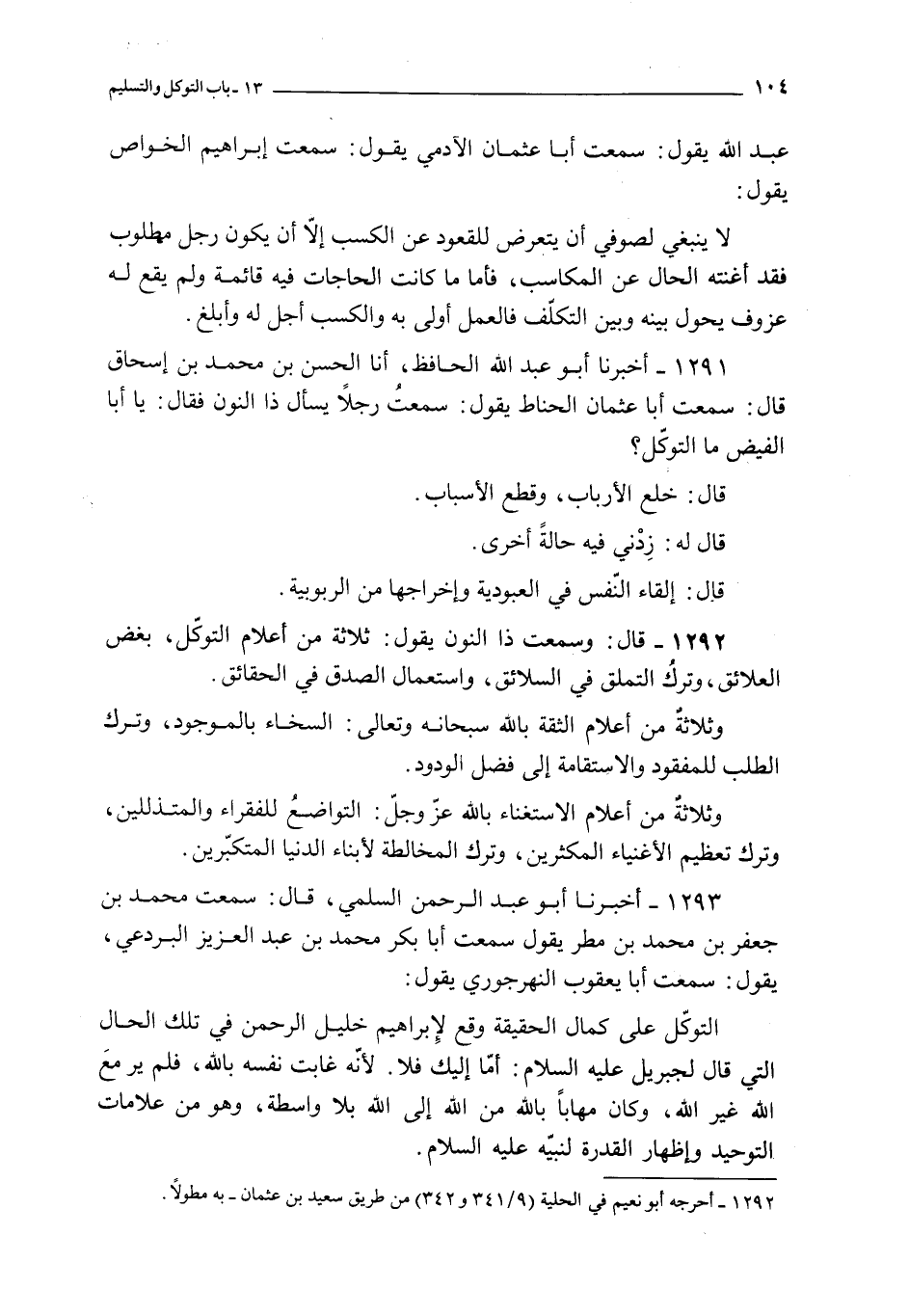 1294 - و بإسناده قال : سمعت النهرجوري يقول : التوكل يصح على حالين أحدهما تدل الأسباب على الله و الصبر تحت الأحجام عند فقد الأسباب و الثاني و الرجوع إلى الله بطلب السكون إليه حتى يقم السكون
