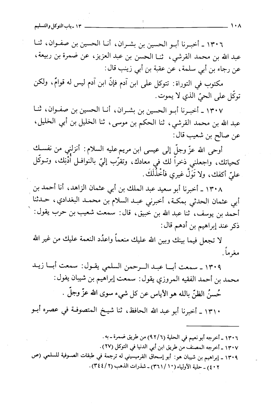 1308 - أخبرنا أبو سعيد عبد الملك بن أبي عثمان الزاهد أنا أحمد بن أبي عثمان الحدثي بمكة أخبرني عبد السلام بن محمد البغدادي حدثنا أحمد بن يوسف ثنا عبد الله بن خبيق قال : سمعت شعيب بن حرب يقول : ذكر عند إبراهيم بن أدهم قال : لا تجعل فيما بينك و بين الله عليك منعما و اعدد النعمة عليك من غير الله مغرما