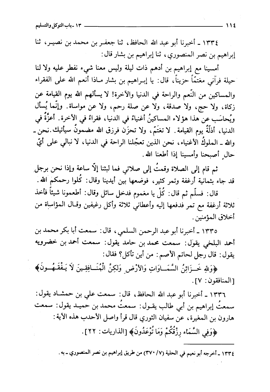 1334 - أخبرنا أبو عبد الله الحافظ ثنا جعفر بن محمد بن نصير ثنا إبراهيم بن نصر المنصوري ثنا إبراهيم بن بشار قال : أمسينا مع إبراهيم بن أدهم ذات ليلة و ليس معنا شيء نفطر عليه و لا لنا حيلة فرآني مغتما حزينا قال : يا إبراهيم بن بشار ماذا أنعم الله على الفقراء و المساكين من النعم و الراحة في الدنيا و الآخرة ! لا يسألهم الله يوم القيامة عن زكاة و لا حج و لا صدقة و لا عن صلة رحم و لا عن مواساة و إنما يسأل و يحاسب عن هذا هؤلاء المساكنين أغنياء في الدنيا فقراء في الآخرة أعزة في الدنيا أذلة يوم القيامة لا تغتم و لا تحزن فرزق الله مضمون سيأتيك نحن و الله الملوك الأغنياء نحن الذين تعجلنا الراحة في الدنيا لا نبالي على أي حال أصبحنا و أمسينا إذا أطعنا الله