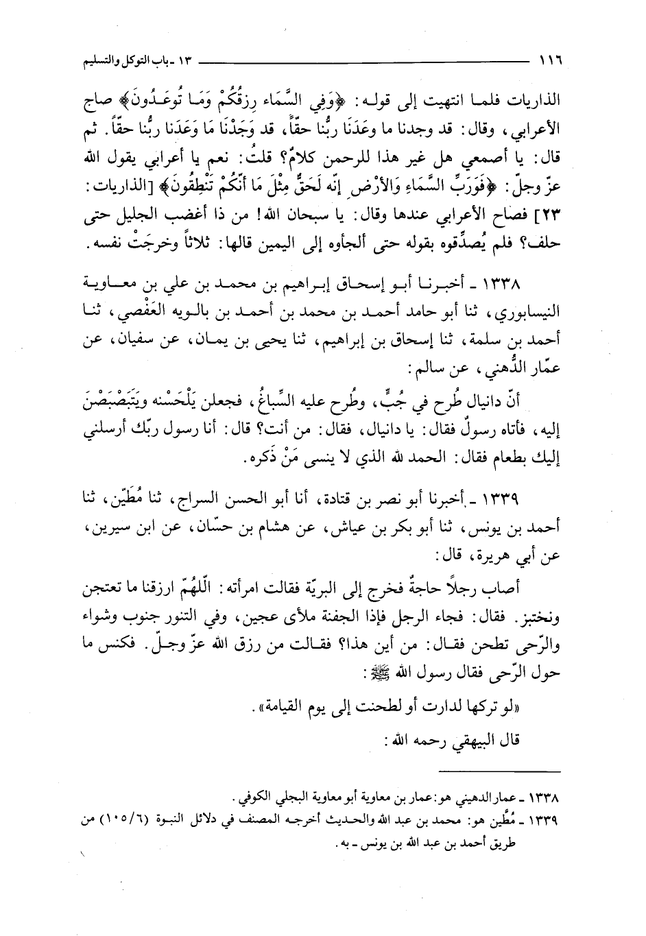 1338 - أخبرنا أبو إسحاق إبراهيم بن محمد بن علي لم بن معاوية النيسابوري ثنا أبو حامد أحمد بن محمد بن أحمد بن بالويه العفصي ثنا أحمد بن سلمة ثنا إسحاق بن إبراهيم ثنا يحيى بن يمان عن سفيان عن عمار الدهني عن سالم : أن دانيال طرح في جب و طرح عليه السباغ فجعلن يلحسنه و يتبصبصن إليه فأتاه رسول فقال : يا دانيال فقال : من أنت ؟ قال : أنا رسول ربك أرسلني إليك بطعام فقال : الحمد لله الذي لا ينسى من ذكره