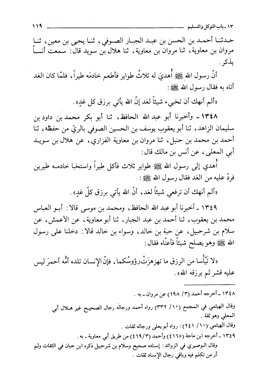 1348 - و أخبرنا أبو عبد الله الحافظ ثنا أبو بكر محمد بن داود بن سليمان الزاهد ثنا أبو يعقوب يوسف بن الحسين الصوفي بالري من حفظه ثنا أحمد بن محمد بن حنبل ثنا مروان بن معاوية الفزاري عن هلال بن سويد أبي المعلى عن أنس بن مالك قال : أهدي إلى رسول الله صلى الله عليه و سلم طواير ثلاث فأكل طيرا و استخبأ خادمه طيرين فرد عليه من الغد فقال رسول الله صلى الله عليه و سلم :