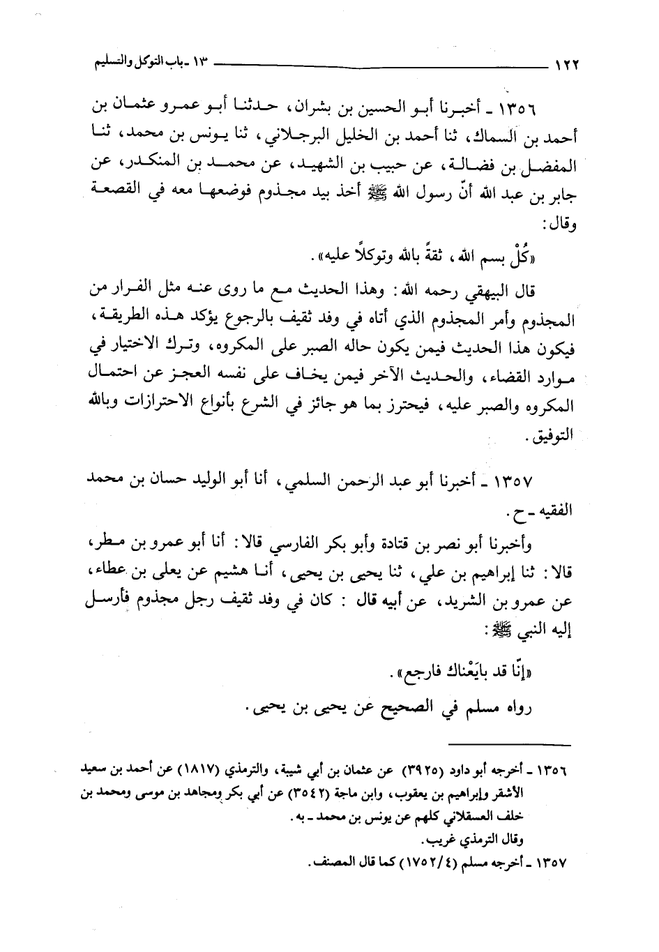 و أخبرنا أيو نصر بن قتادة و أبو بكر الفارسي قالا : أنا أبو عمرو بن مطر قالا : ثنا إبراهيم بن علي ثنا يحيى بن يحيى أنا هشيم عن يعلى بن عطاء عن عمرو بن الشريد عن أبيه قال : كان في وفد ثقيف رجل مجذوم فأرسل إليه النبي صلى الله عليه و سلم :