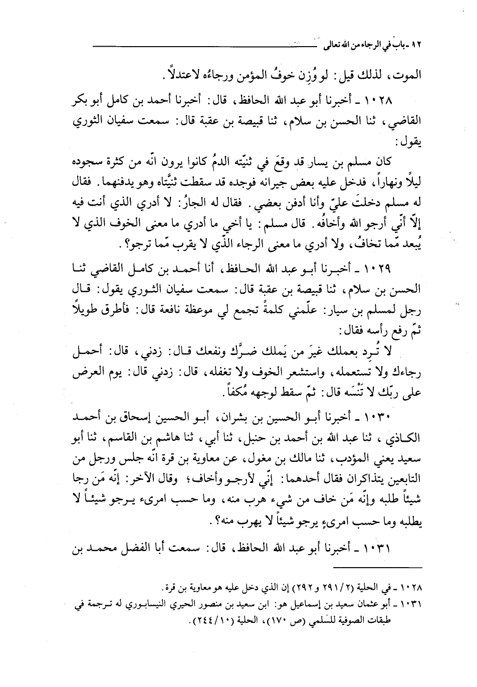 1030 - أخبرنا أبو الحسين بن بشران أبو الحسين إسحاق بن أحمد الكاذي ثنا عبد الله بن أحمد بن حنبل ثنا أبي ثنا هاشم بن القاسم ثنا أبو سعيد يعني المؤدب ثنا مالك بن مغول عن معاوية بن قرة : أنه جلس و رجل من التابعين يتذاكران فقال أحدهما : إني لأرجو و أخاف و قال الآخر : إنه من رجا شيئا طلبة و إنه من خاف من شيء هرب منه و ما حسب امرئ يرجو شيئا يطلبه و ما حسب امرئ يرجو شيئا لا يهرب منه ؟