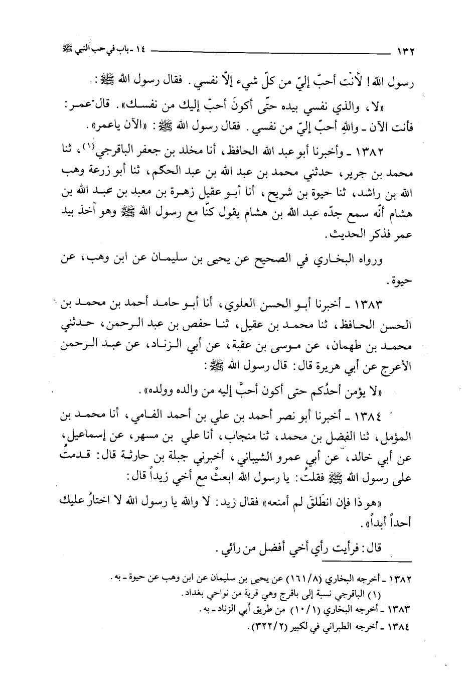 1382 - أخبرنا أبو عبد الله الحافظ أنا مخلد بن جعفر الباقرجي ثنا محمد بن جرير حدثني محمد بن عبد الله بن عبد الحكم ثنا أبو زرعة وهب الله بن راشد ثنا حيوة بن شريح أنا أبو عقيل زهرة بن معبد بن عبد الله بن هشام : أنه سمع جده عبد الله بن هشام يقول كنا مع رسول الله صلى الله عليه و سلم و هو آخذ بيد عمر فذكر الحديث