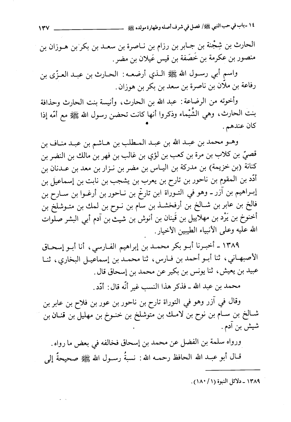 1389 - أخبرنا أبو بكر محمد بن إبراهيم الفارسي أنا أبو إسحاق الأصبهاني ثنا أبو أحمد بن فارس ثنا محمد بن إسماعيل البخاري ثنا عبيد بن يعيش ثنا يونس بن بكير عن محمد بن إسحاق قال : ـ محمد بن عبد الله ـ فذكر هذا النسب غير أن قال : أدد