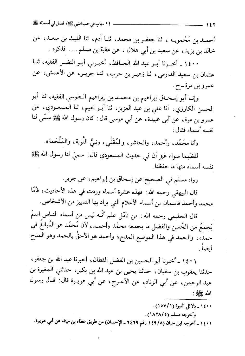 قال البيهقي رحمه الله : فهذه عشرة أسماء وردت في هذه الأحاديث فأما محمد و أحمد فاسمان من أسماء الأعلام التي يراد بها التمييز من الأشخاص